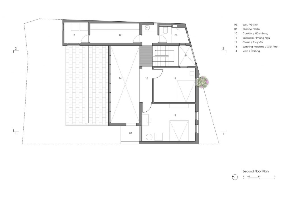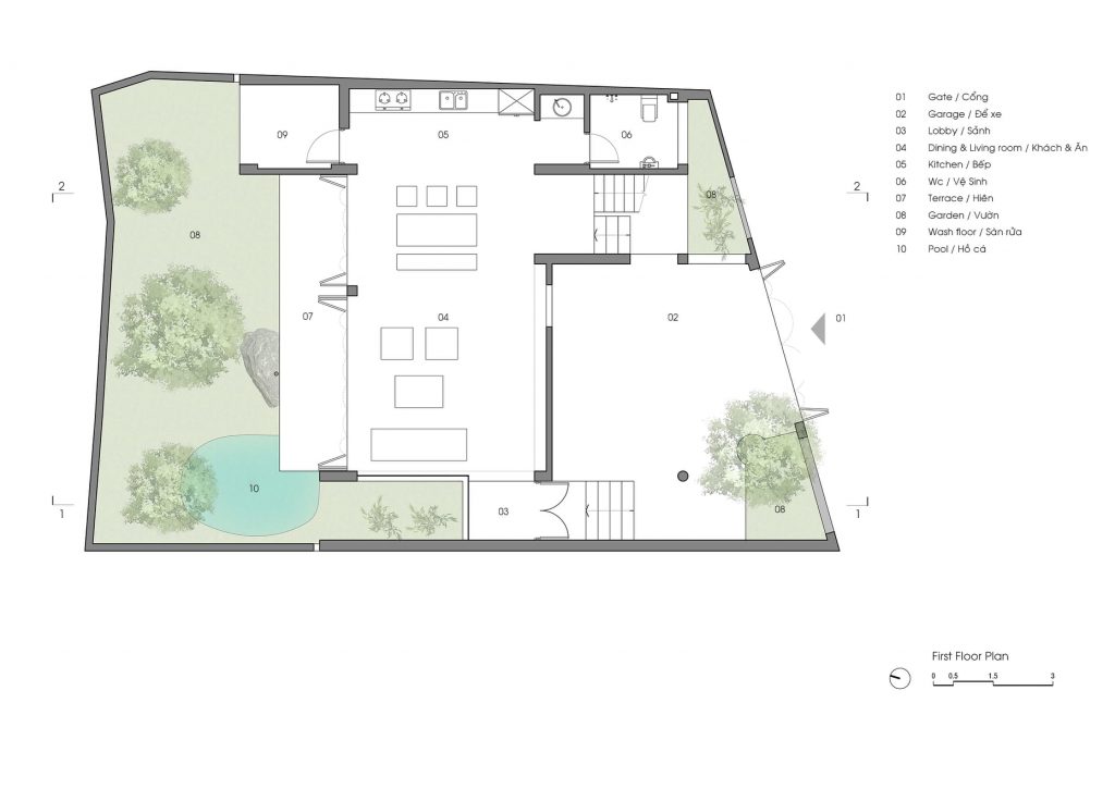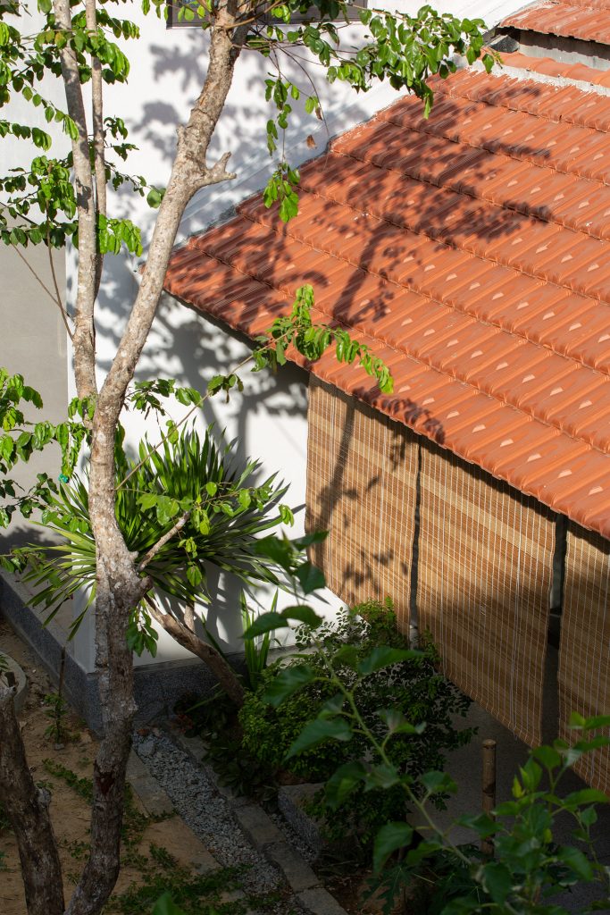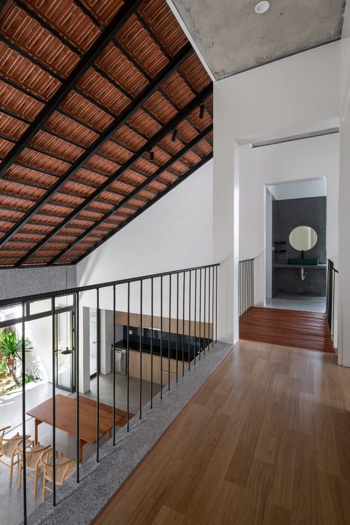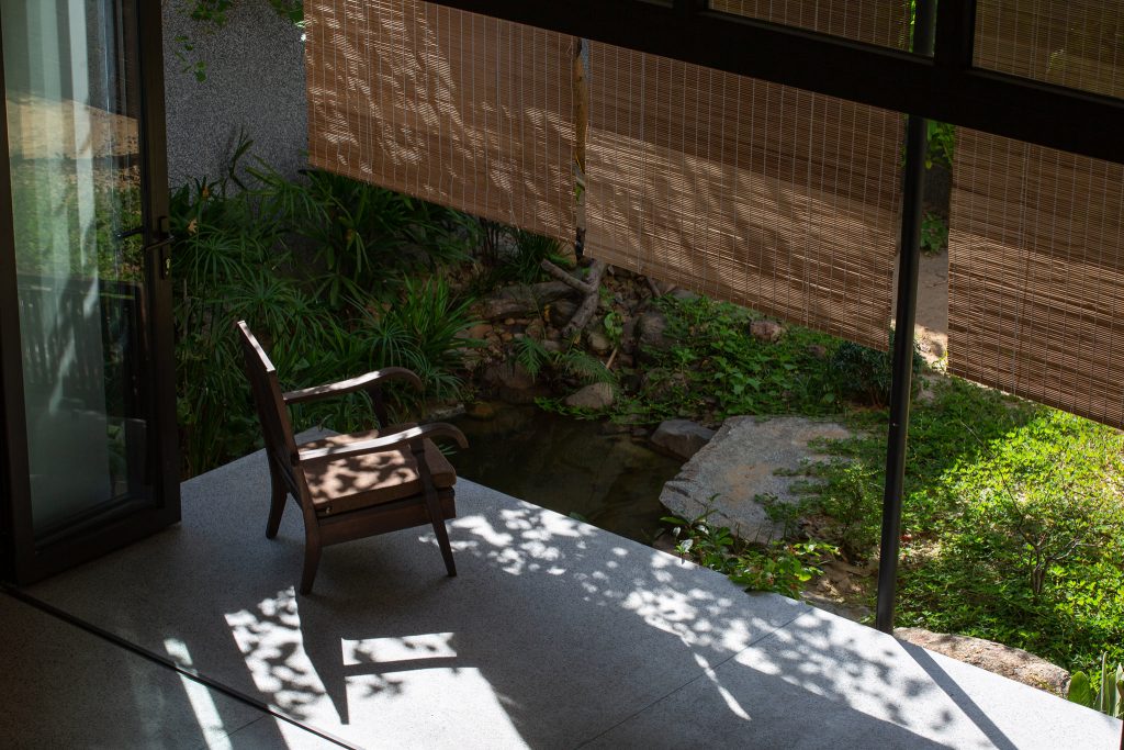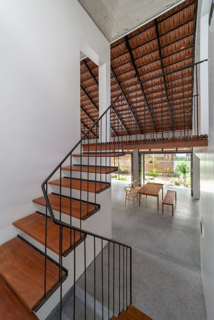 Từ đó một ý tưởng về không gian nhiều lớp, dàn trải dần hình thành tạo ra được chiều sâu về không gian cho ngôi nhà. Toàn bộ không gian sinh hoạt chung được mở ra thiên nhiên thông qua các khoảng hiên dài, nhờ vậy mà ánh sáng tự nhiên gián tiếp đi vào không gian cũng vừa phải và dễ chịu hơn.