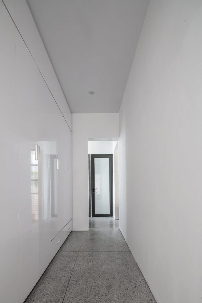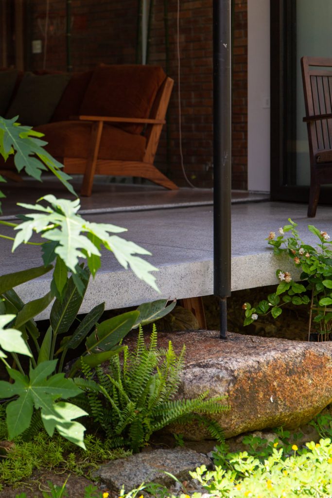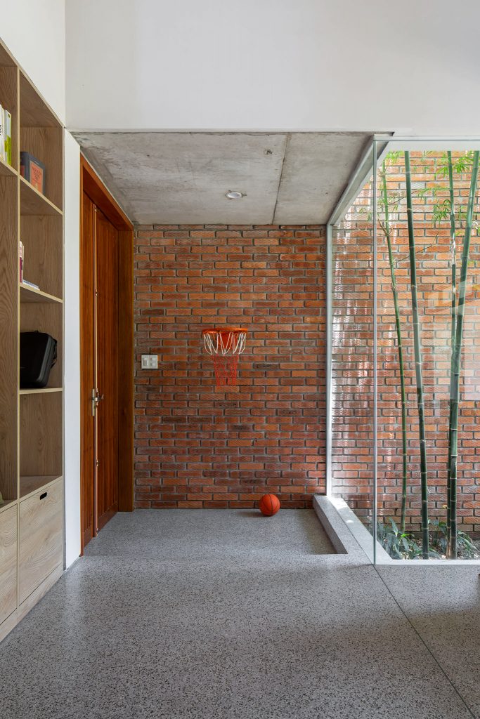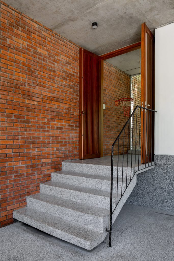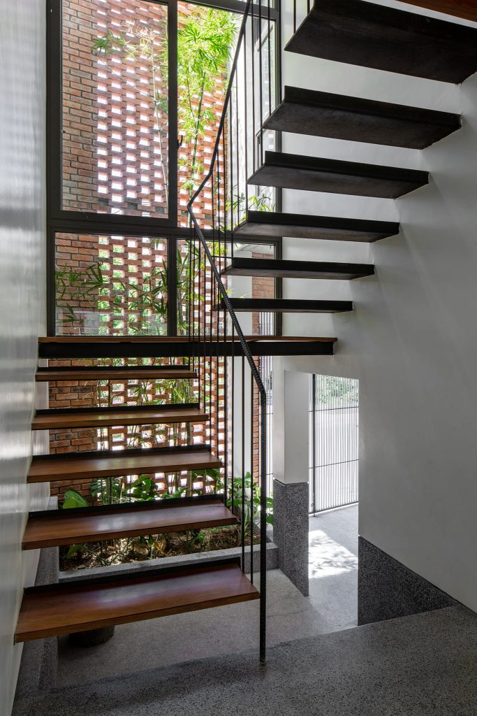 Cao độ của ngôi nhà được nghiên cứu để khắc phục tình trạng ngập lụt diễn ra thường xuyên hơn ở thành phố. Không gian gara, sân vườn phía trước được nâng lên vừa đủ để thuận tiện cho việc tiếp cận. Một cầu thang ít bậc chuyển tiếp lên cao độ cao hơn của không gian chính, giải pháp này giúp cho toàn bộ không gian sinh hoạt chính an toàn trong mùa mưa nhưng vẫn hài hòa giữa trong và ngoài của ngôi nhà.