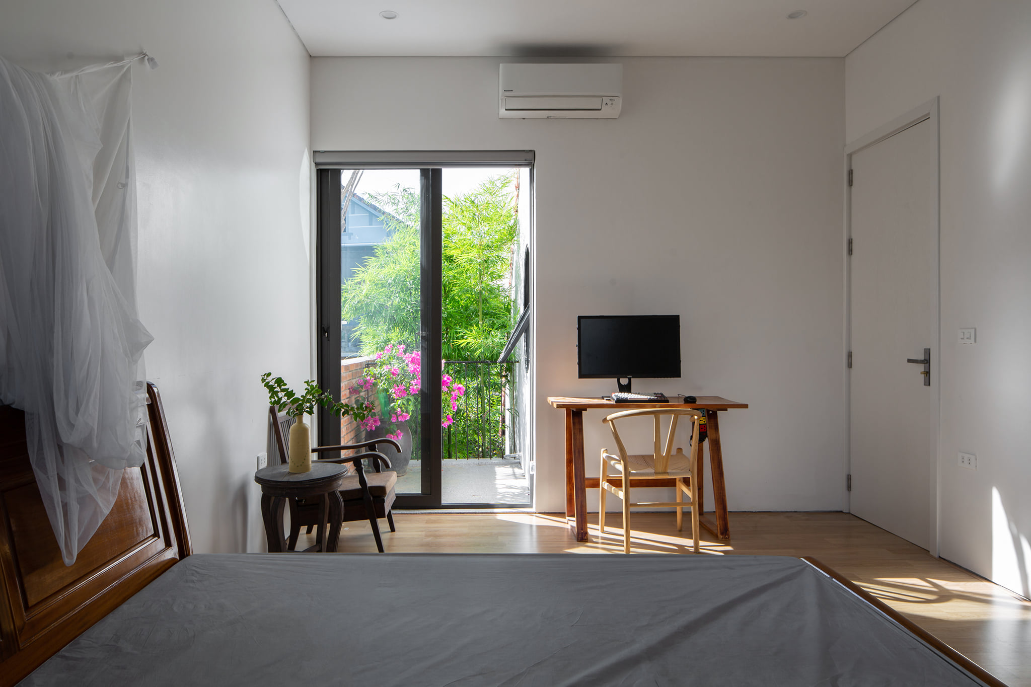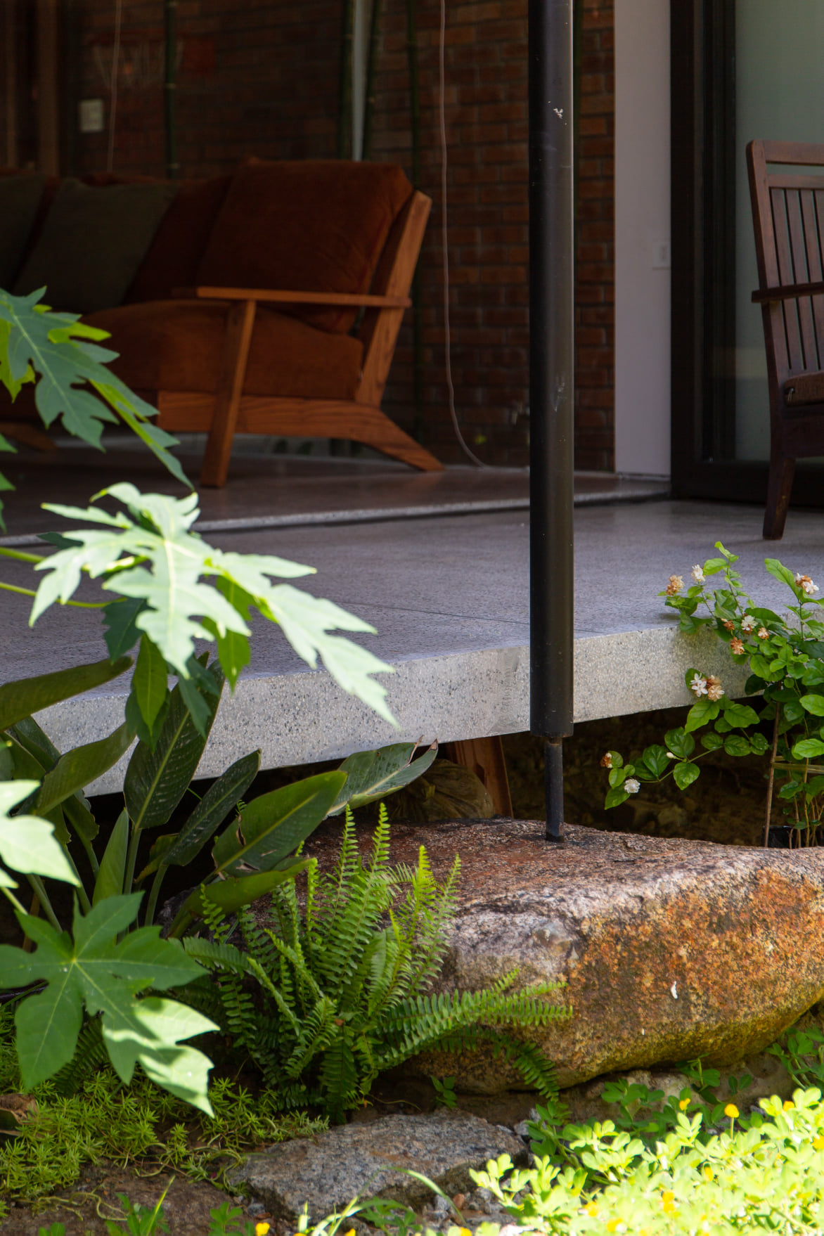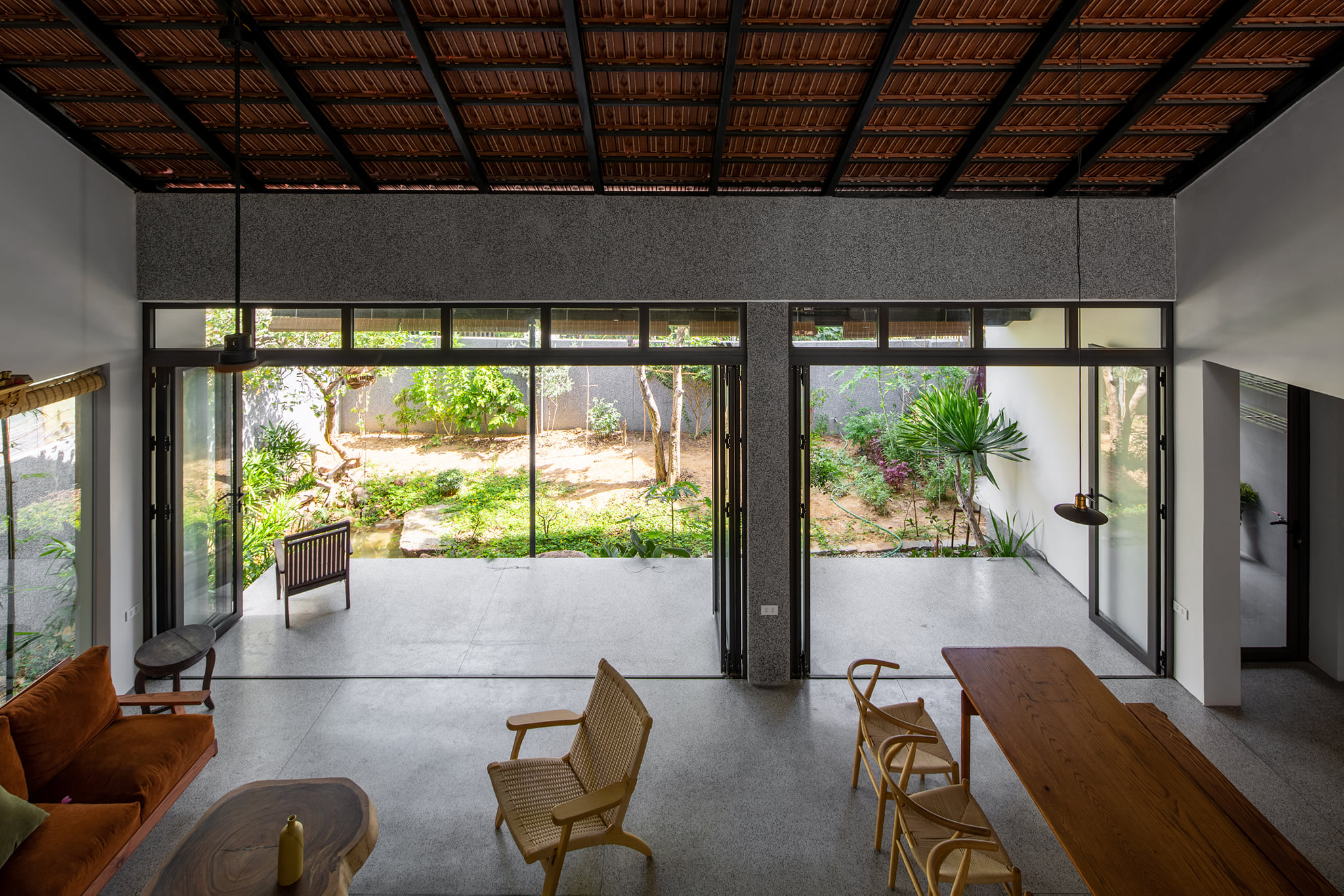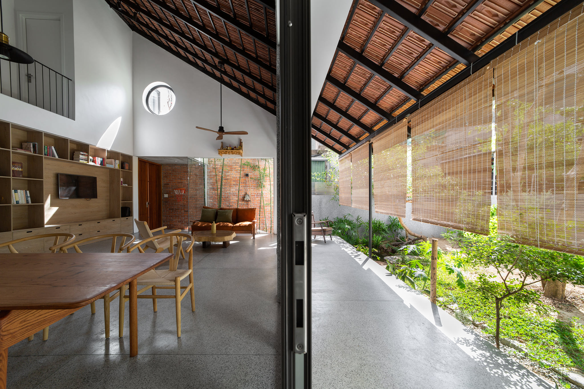 Từ đó một ý tưởng về không gian nhiều lớp, dàn trải dần hình thành tạo ra được chiều sâu về không gian cho ngôi nhà. Toàn bộ không gian sinh hoạt chung được mở ra thiên nhiên thông qua các khoảng hiên dài, nhờ vậy mà ánh sáng tự nhiên gián tiếp đi vào không gian cũng vừa phải và dễ chịu hơn.