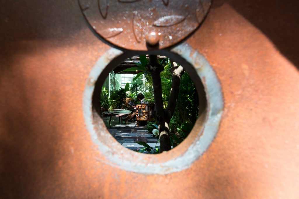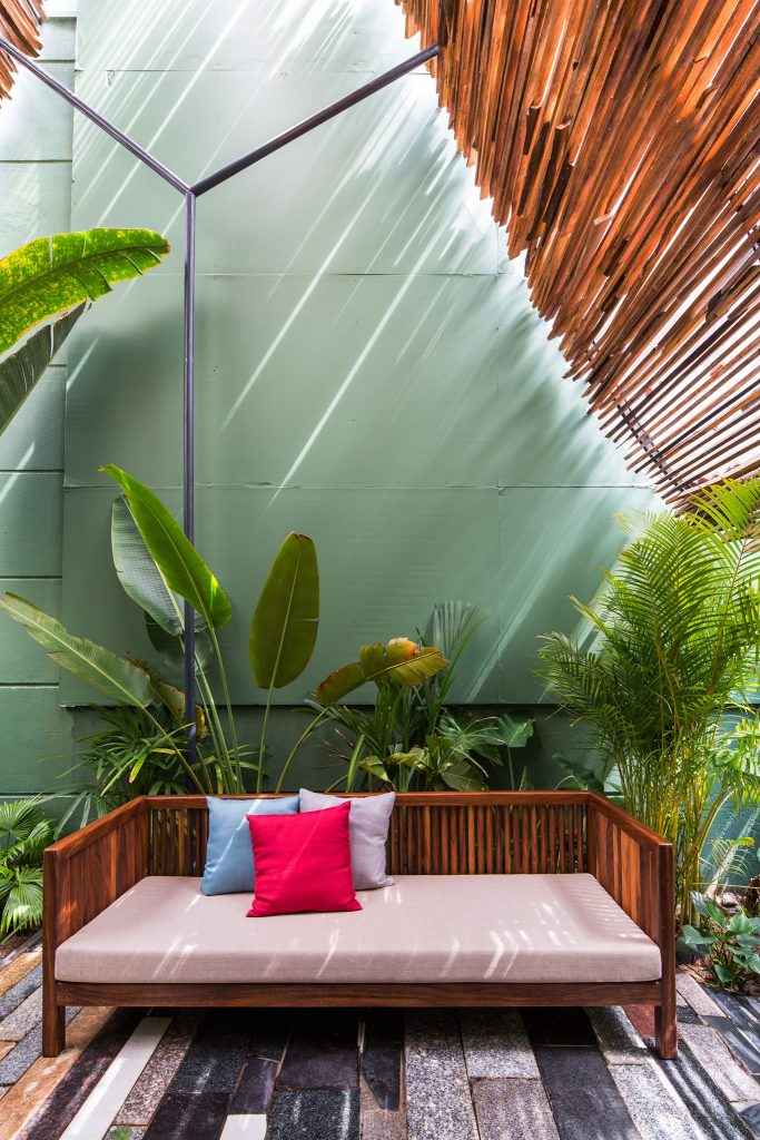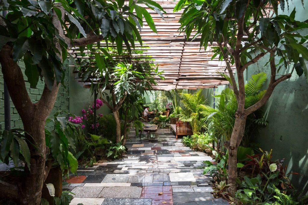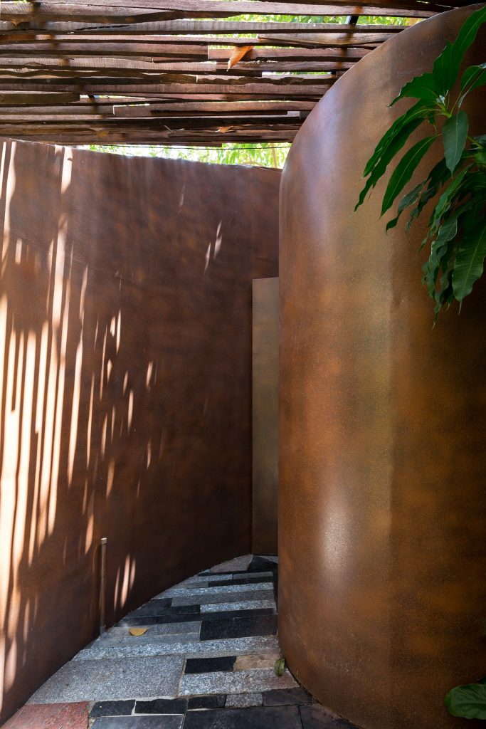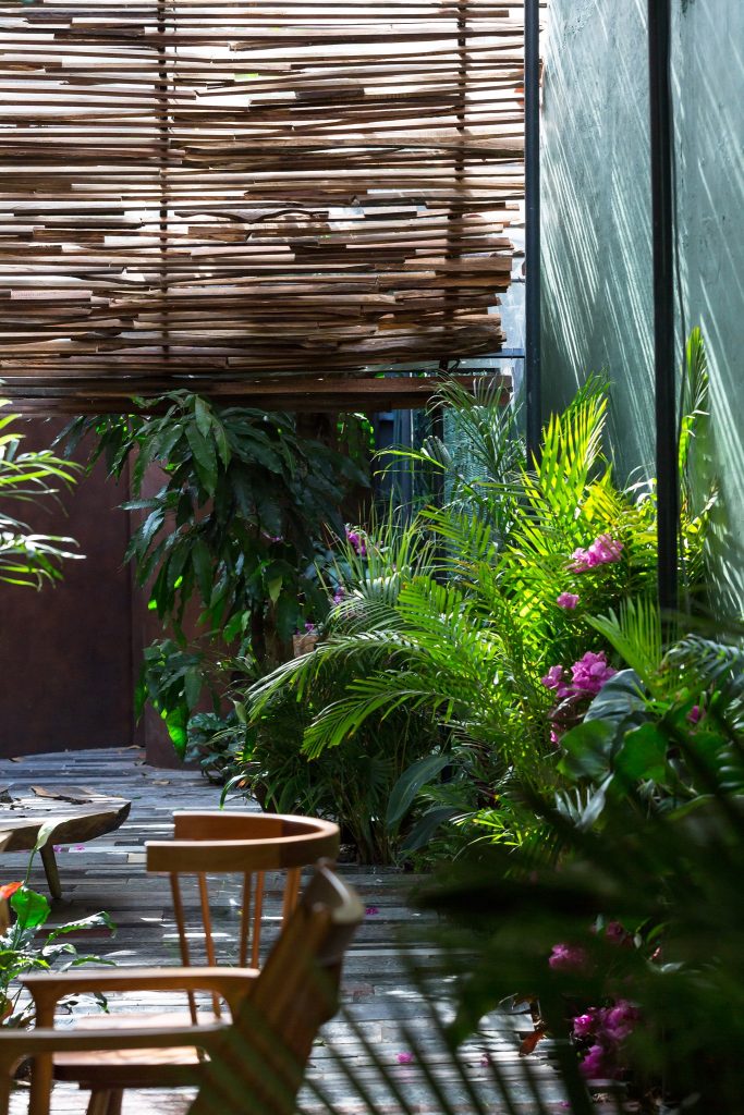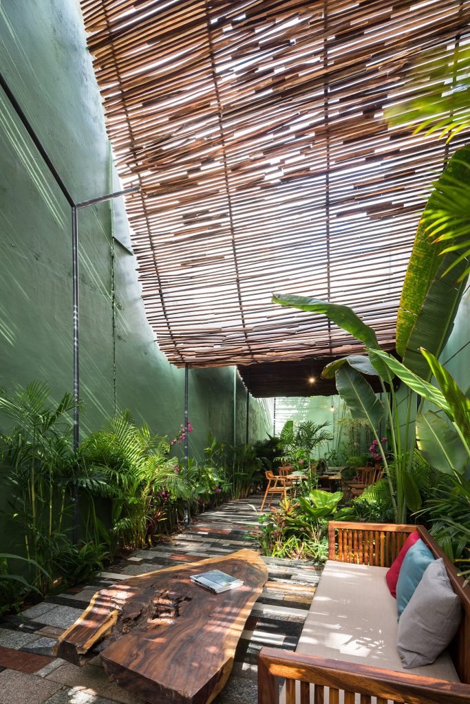 Thế nên mọi vật liệu dư thừa, lượm lặt, mọi lợi thế của khu đất, mọi nguồn nhân lực có sẵn đều được sử dụng triệt để: nhân công là thợ của xưởng gỗ cùng các bạn ở văn phòng, đá bìa thải ra từ các mỏ đá địa phương để làm sàn, những mẫu gỗ thừa của xưởng gỗ để lợp mái, cây xanh có sẵn tại khu đất và còn dư của các công trình thi công để làm vườn, mượn mảng tường của 6 nhà hàng xóm sơn lại làm vỏ bao che… tất cả để tạo nên một công trình tự nhiên, hoang dã nhất có thể với tên gọi “sóng ở Vũng Tàu”.