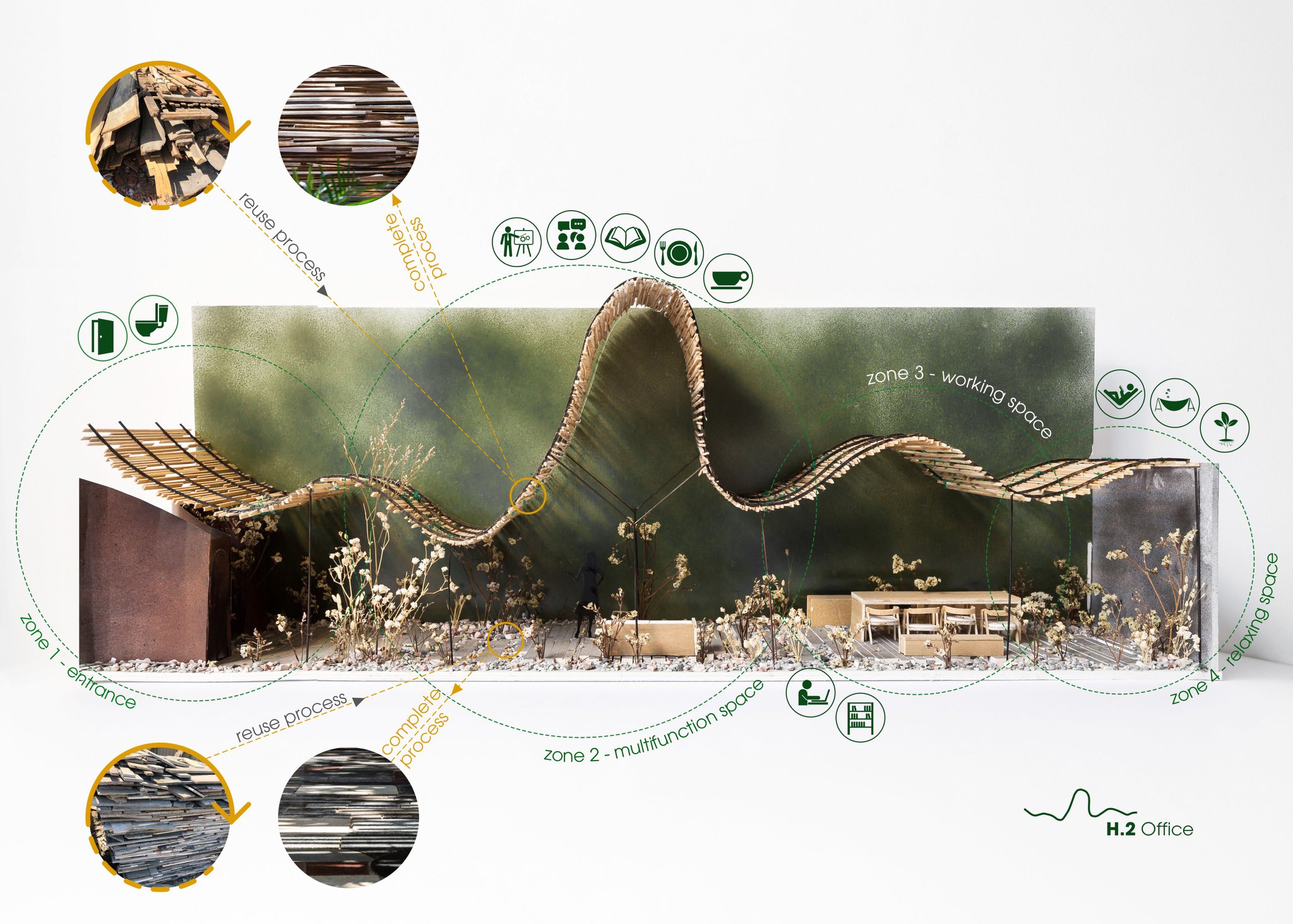 Đề bài đặt ra là: chi phí rẻ nhất, xây dựng nhanh nhất, có thể di chuyển để tái sử dụng khi trả mặt bằng, nhưng phải thể hiện được tinh thần của văn phòng thiết kế trẻ yêu thích thiên nhiên, phải trình diễn được kĩ thuật thi công của xưởng gỗ, và hơn hết là gợi nhớ về một thành phố biển thanh bình, yên ả…
