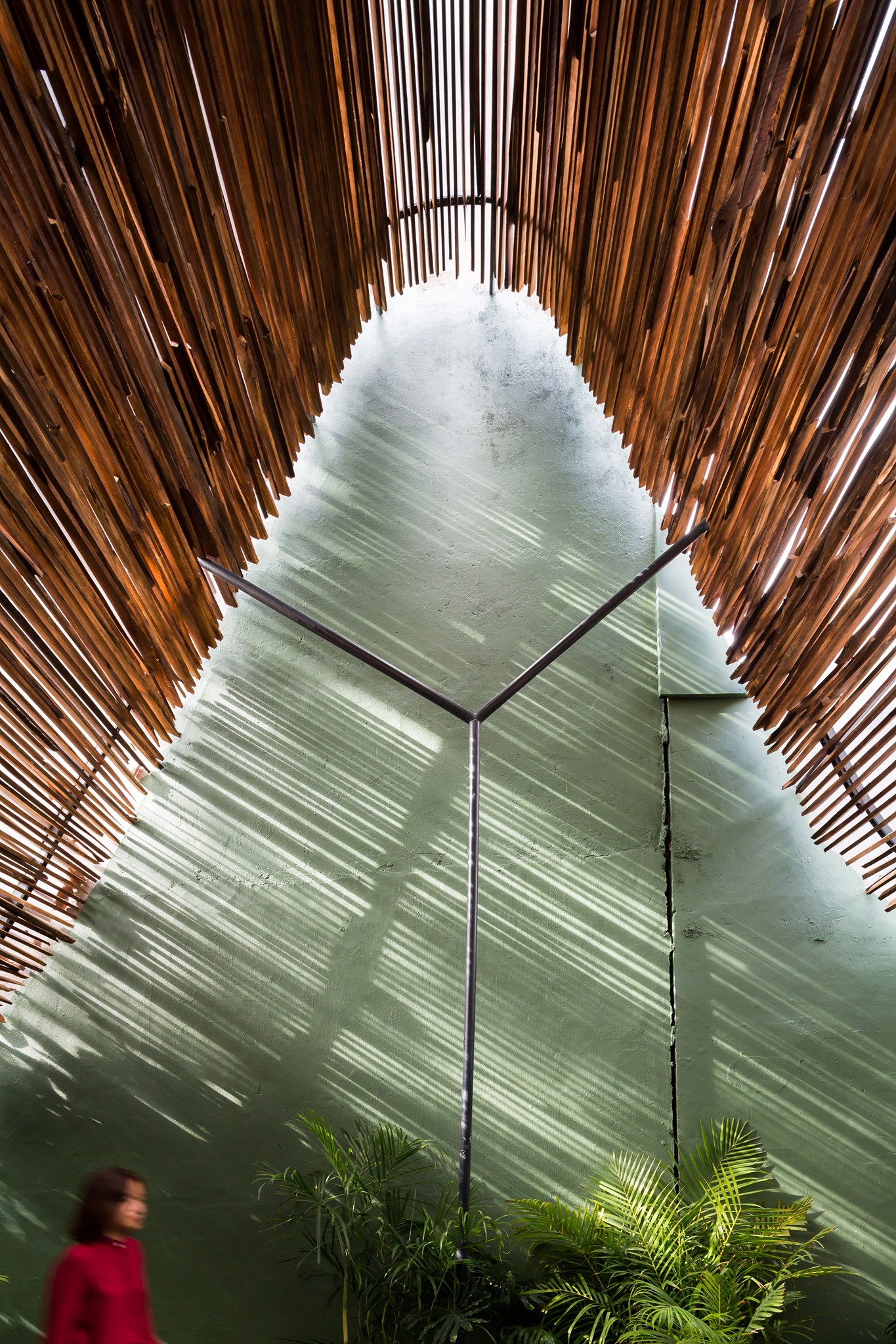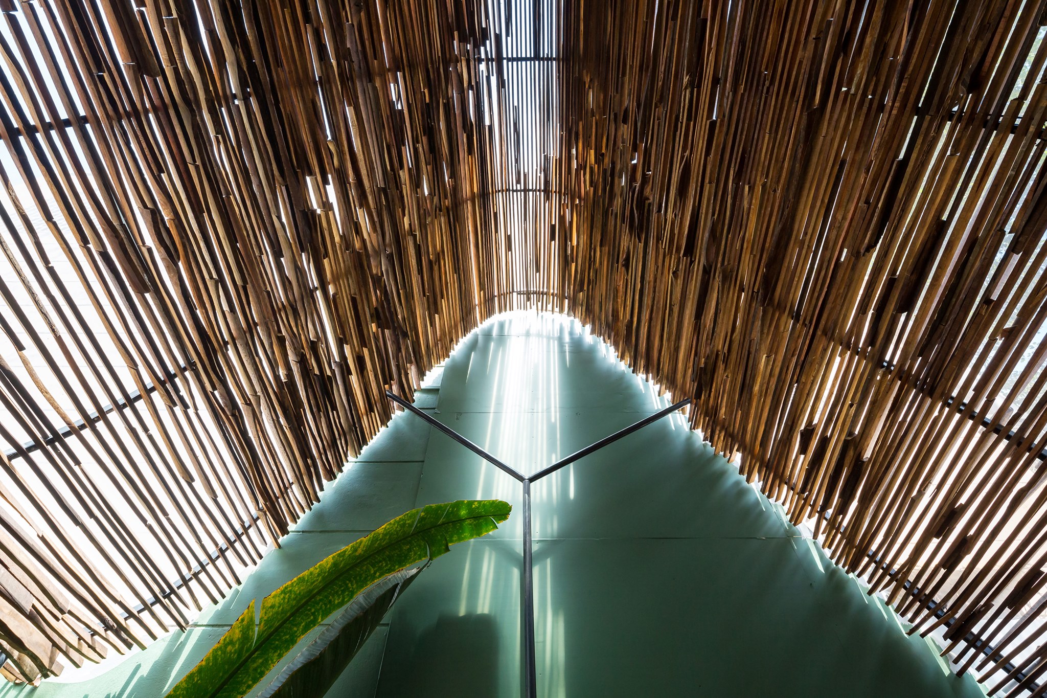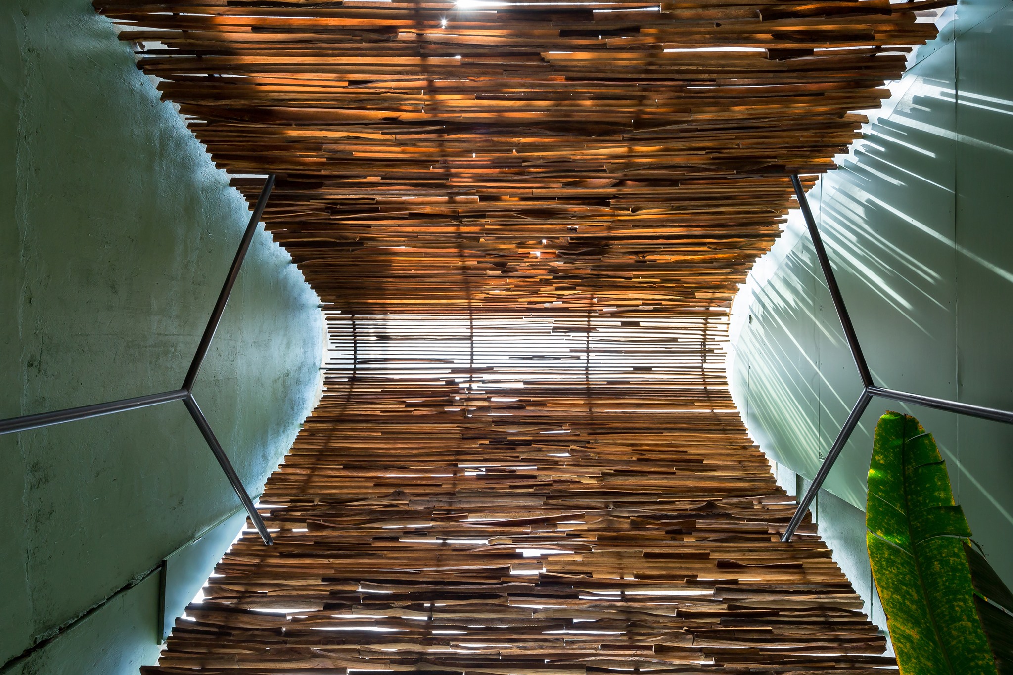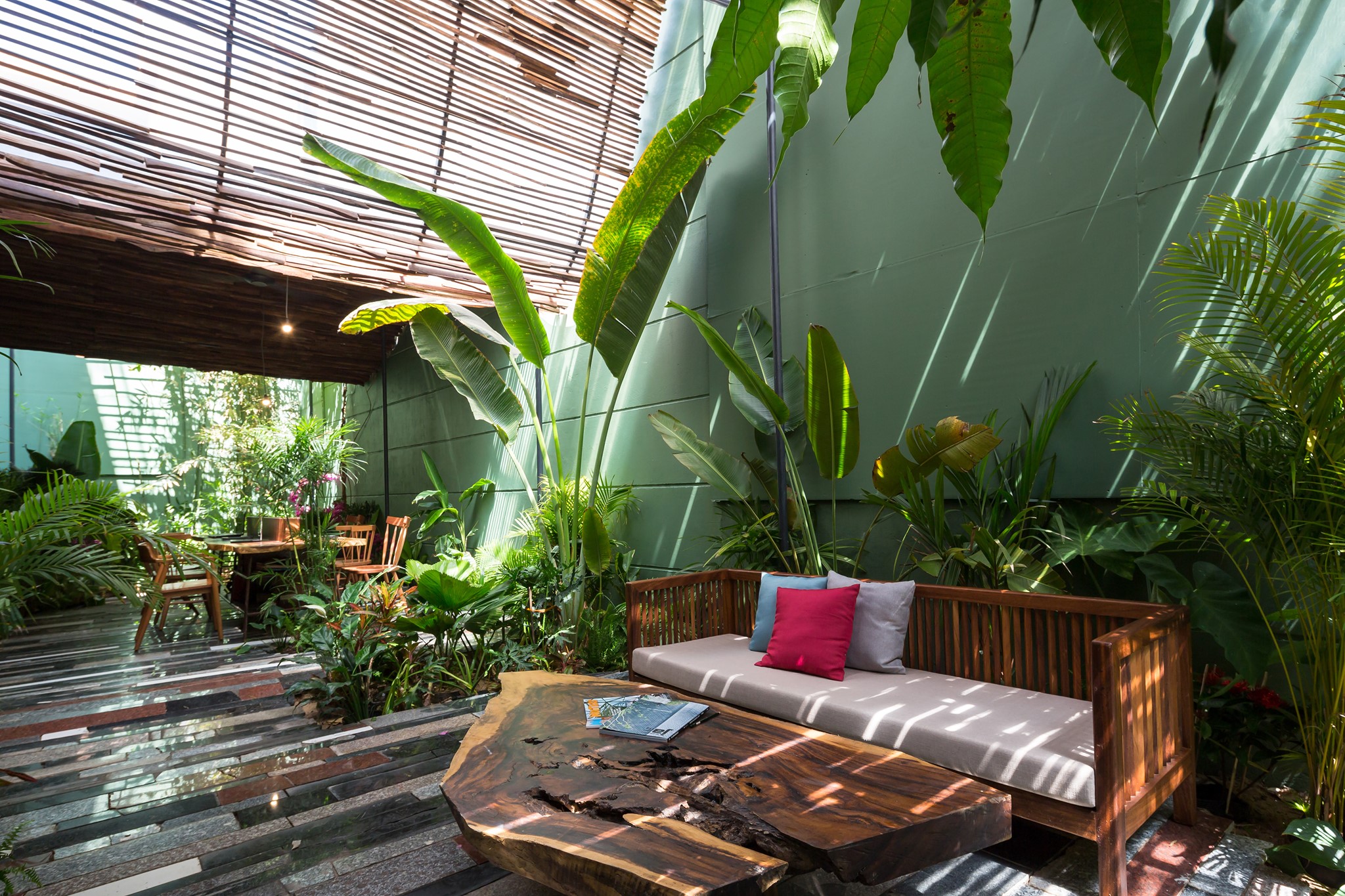 Thế nên mọi vật liệu dư thừa, lượm lặt, mọi lợi thế của khu đất, mọi nguồn nhân lực có sẵn đều được sử dụng triệt để: nhân công là thợ của xưởng gỗ cùng các bạn ở văn phòng, đá bìa thải ra từ các mỏ đá địa phương để làm sàn, những mẫu gỗ thừa của xưởng gỗ để lợp mái, cây xanh có sẵn tại khu đất và còn dư của các công trình thi công để làm vườn, mượn mảng tường của 6 nhà hàng xóm sơn lại làm vỏ bao che… tất cả để tạo nên một công trình tự nhiên, hoang dã nhất có thể với tên gọi “sóng ở Vũng Tàu”.