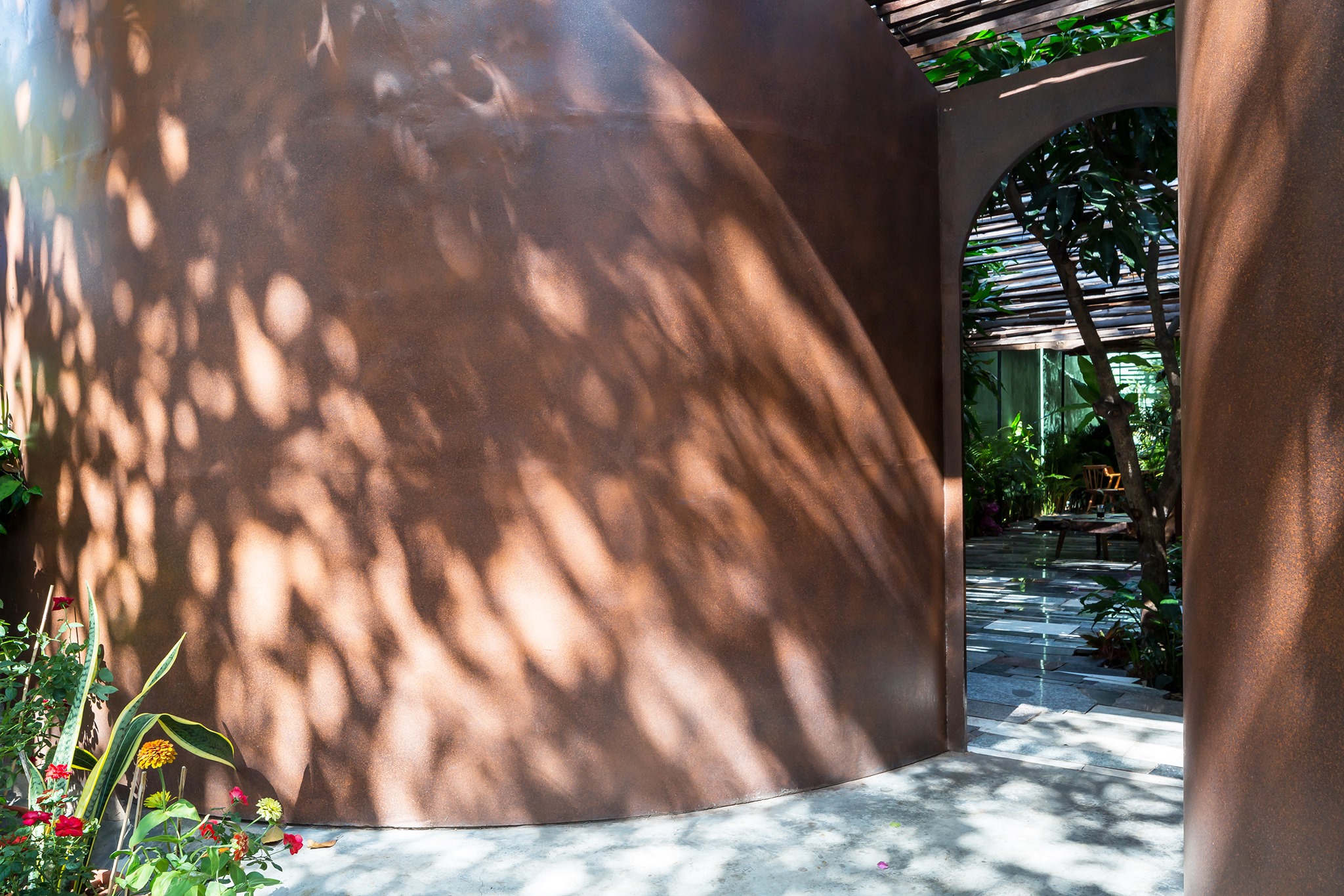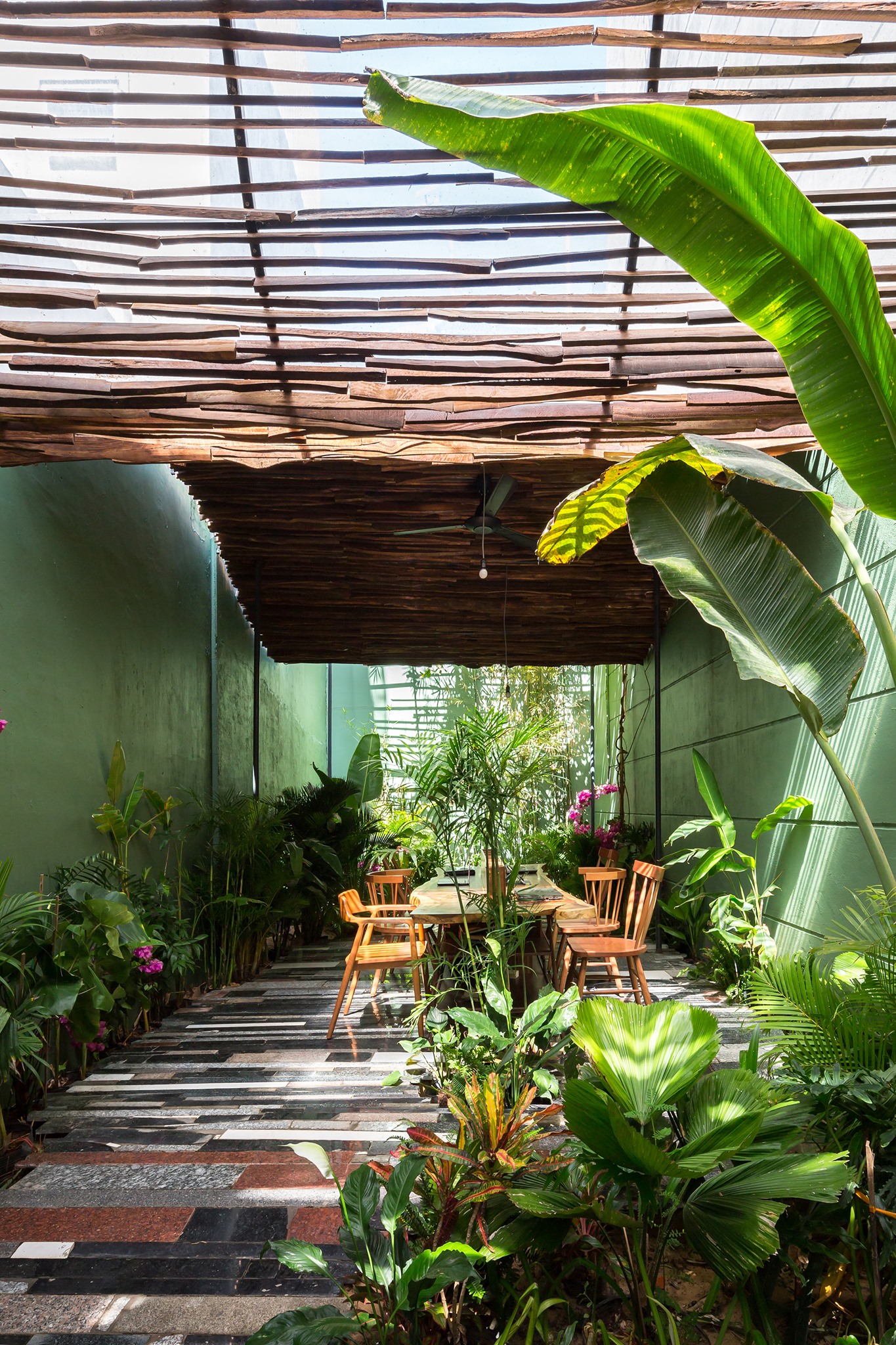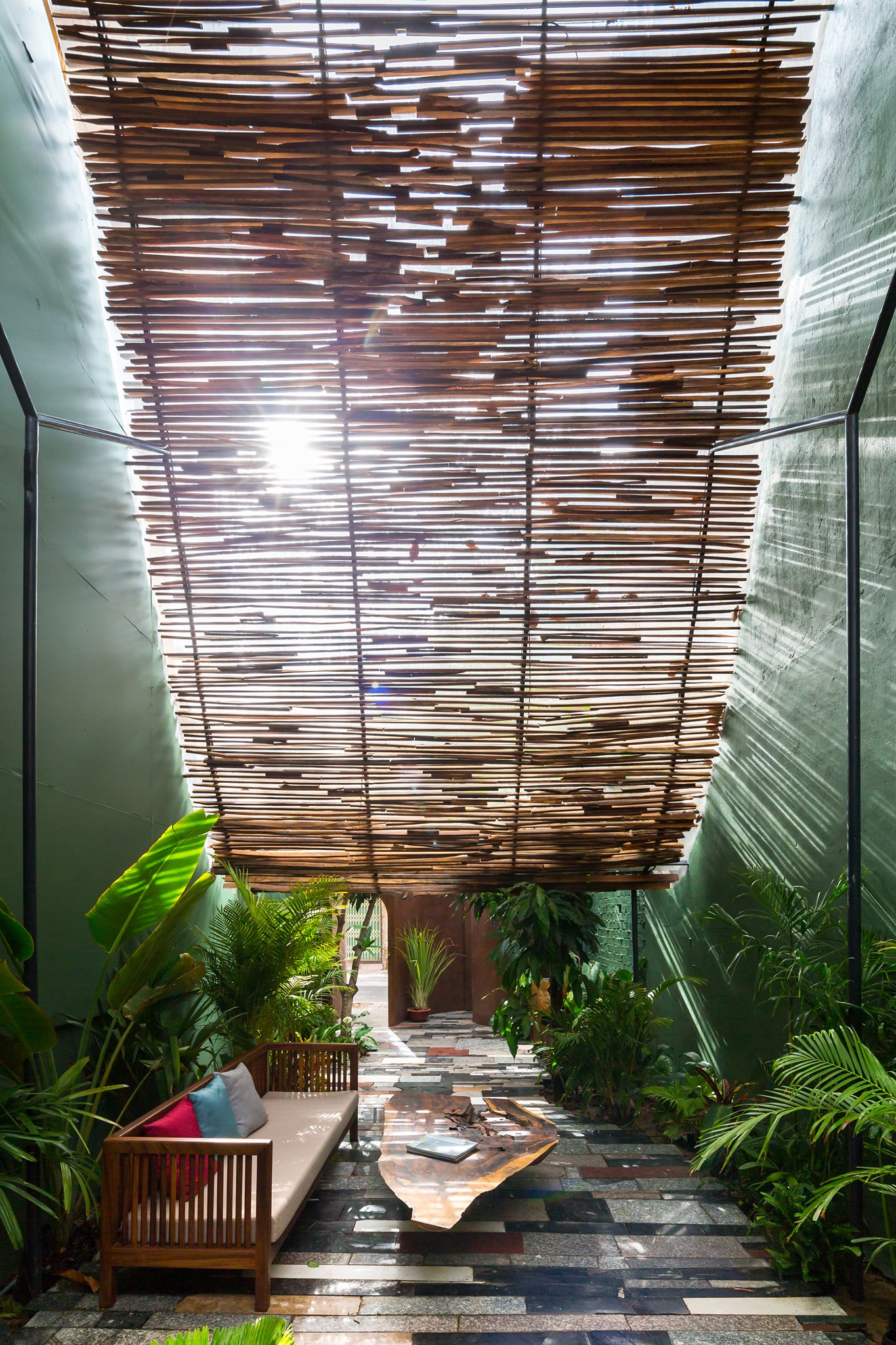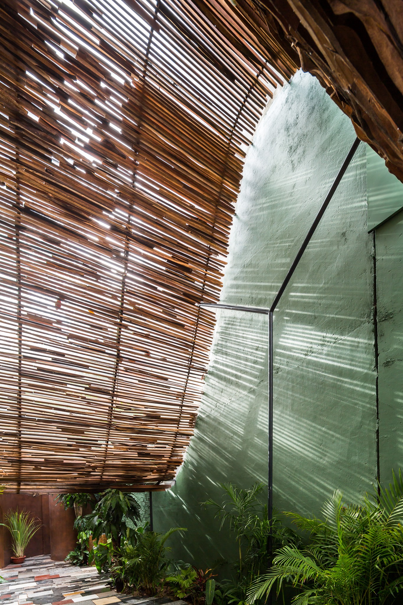 Thế nên mọi vật liệu dư thừa, lượm lặt, mọi lợi thế của khu đất, mọi nguồn nhân lực có sẵn đều được sử dụng triệt để: nhân công là thợ của xưởng gỗ cùng các bạn ở văn phòng, đá bìa thải ra từ các mỏ đá địa phương để làm sàn, những mẫu gỗ thừa của xưởng gỗ để lợp mái, cây xanh có sẵn tại khu đất và còn dư của các công trình thi công để làm vườn, mượn mảng tường của 6 nhà hàng xóm sơn lại làm vỏ bao che… tất cả để tạo nên một công trình tự nhiên, hoang dã nhất có thể với tên gọi “sóng ở Vũng Tàu”.