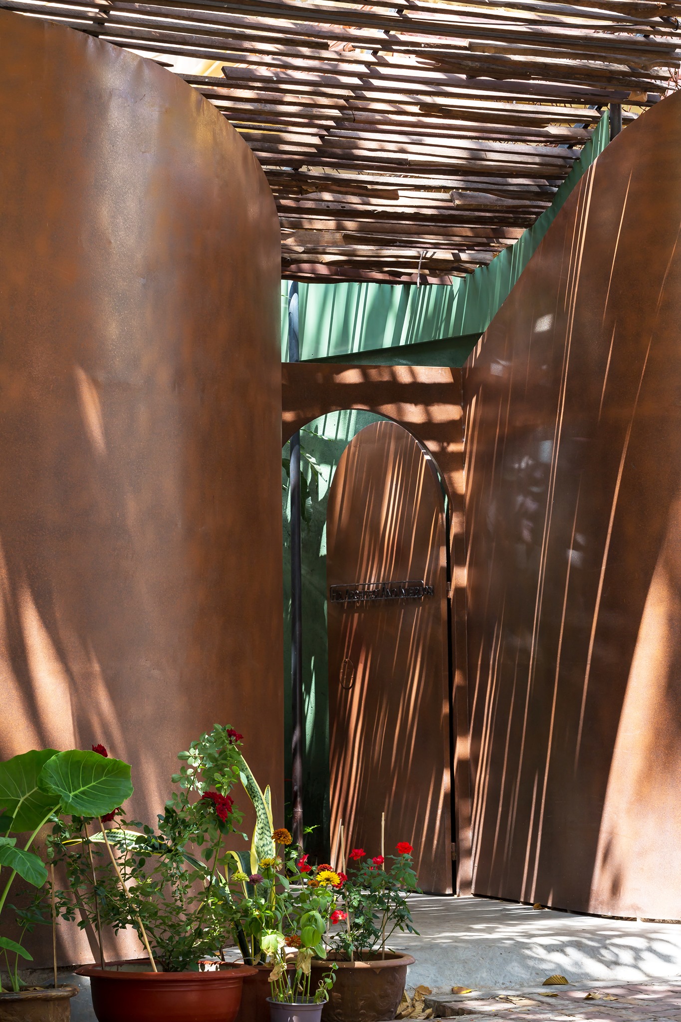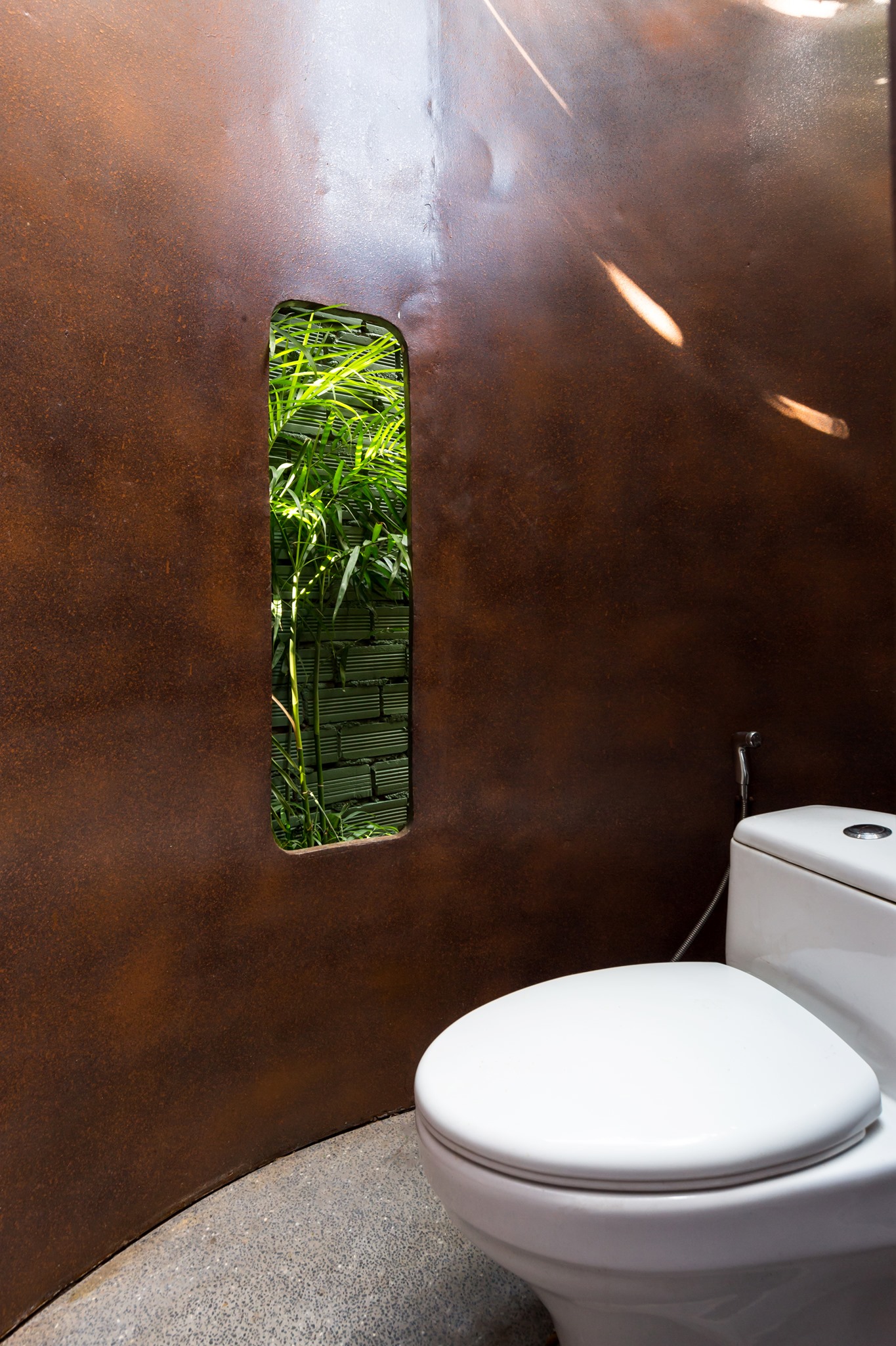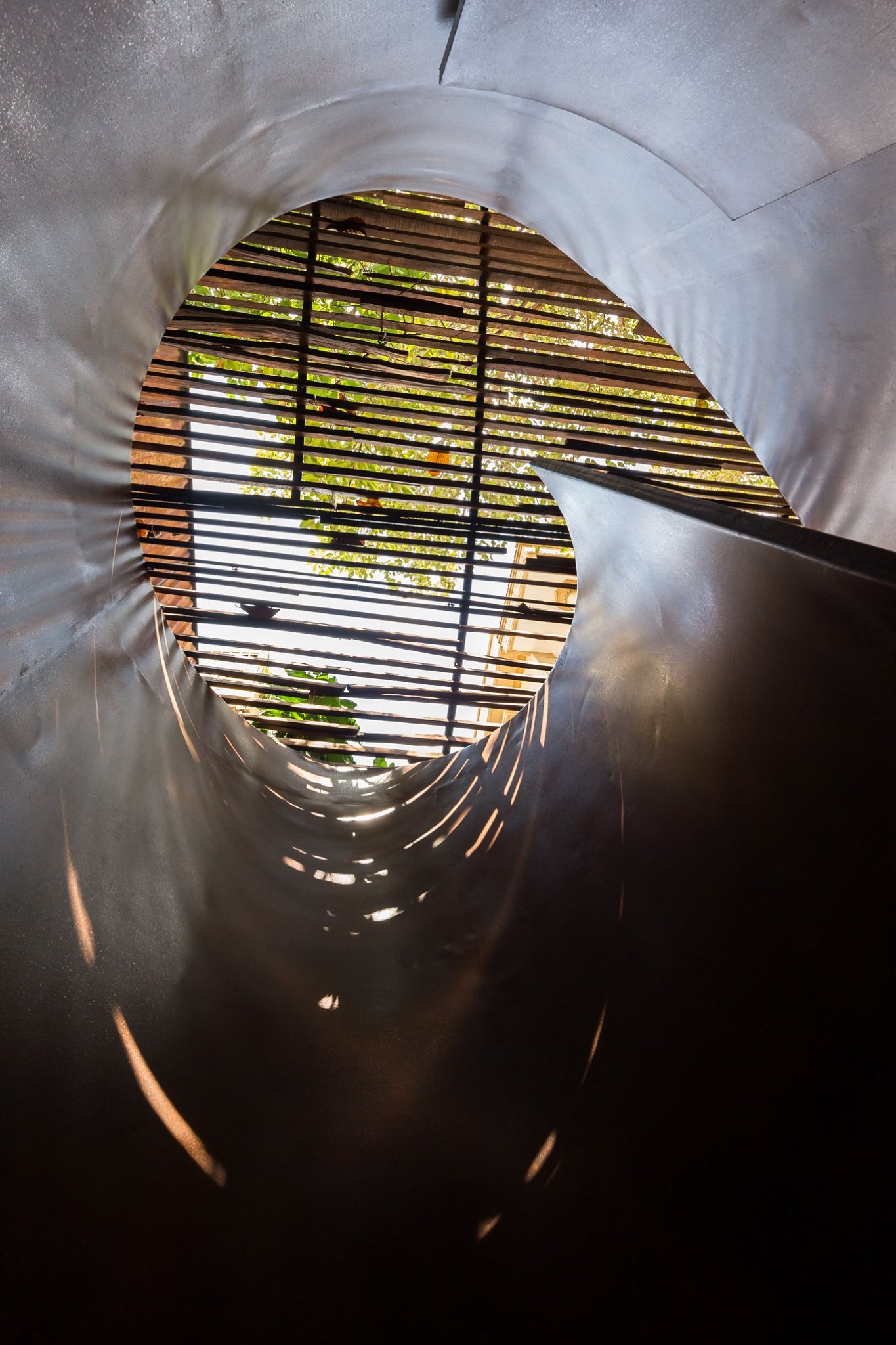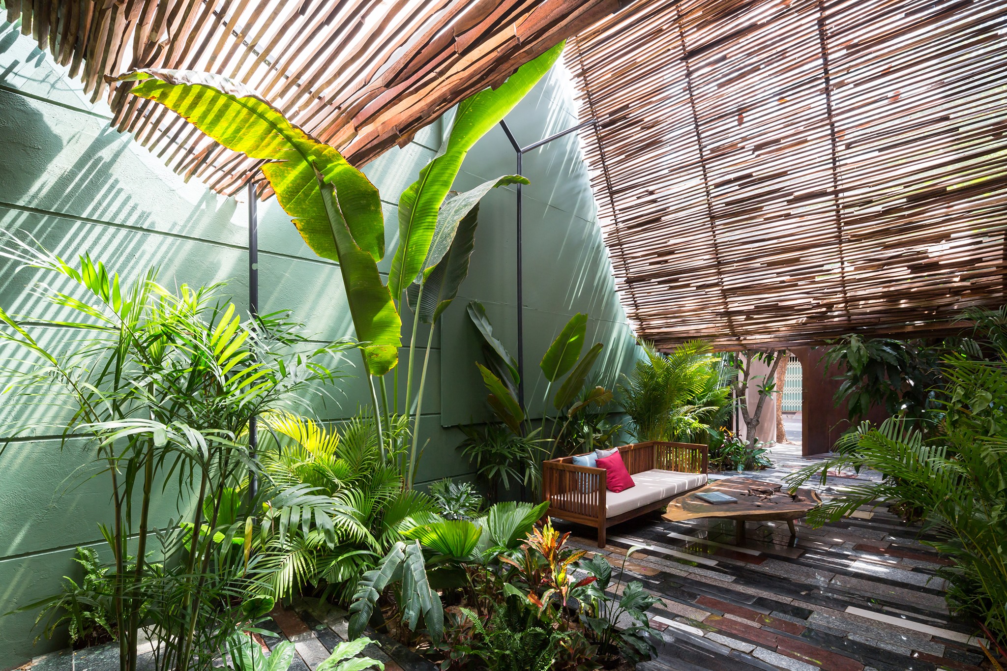 Thế nên mọi vật liệu dư thừa, lượm lặt, mọi lợi thế của khu đất, mọi nguồn nhân lực có sẵn đều được sử dụng triệt để: nhân công là thợ của xưởng gỗ cùng các bạn ở văn phòng, đá bìa thải ra từ các mỏ đá địa phương để làm sàn, những mẫu gỗ thừa của xưởng gỗ để lợp mái, cây xanh có sẵn tại khu đất và còn dư của các công trình thi công để làm vườn, mượn mảng tường của 6 nhà hàng xóm sơn lại làm vỏ bao che… tất cả để tạo nên một công trình tự nhiên, hoang dã nhất có thể với tên gọi “sóng ở Vũng Tàu”.