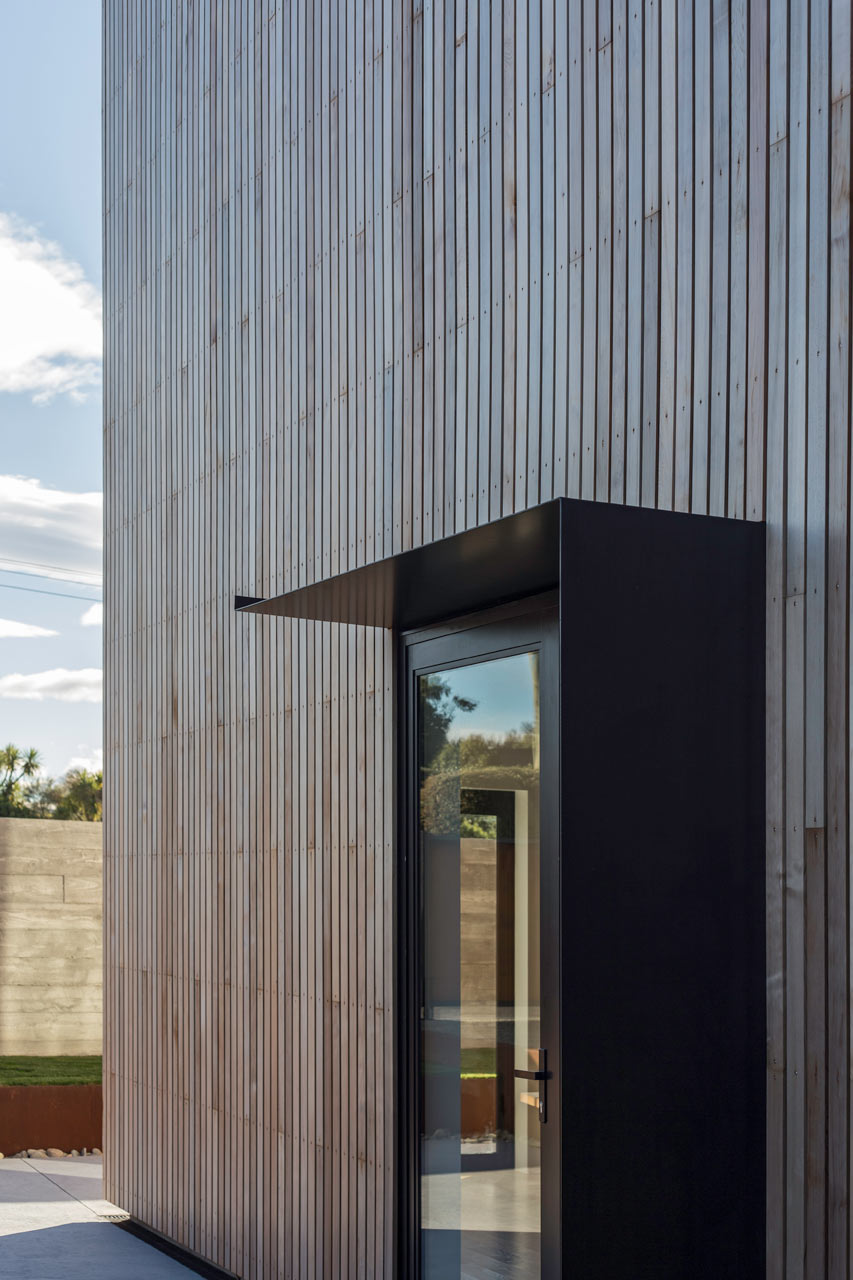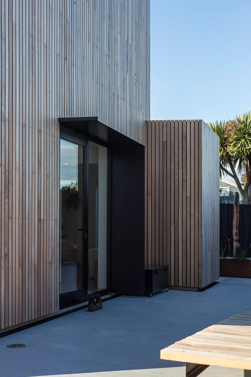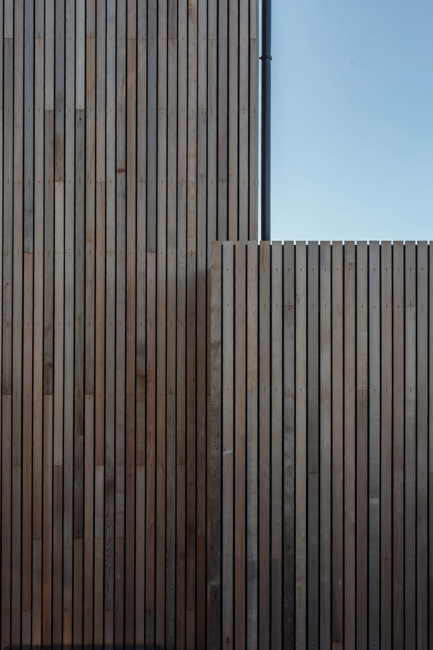 Ngoài ra, lớp bề mặt bên ngoài của ngôi nhà được tạo ra từ vân gỗ tuyết tùng, với công năng như một bức màn ngăn mưa và để nước mưa chảy dọc xuống các rãnh ở giữa các thanh gỗ.