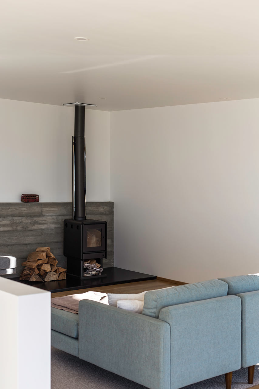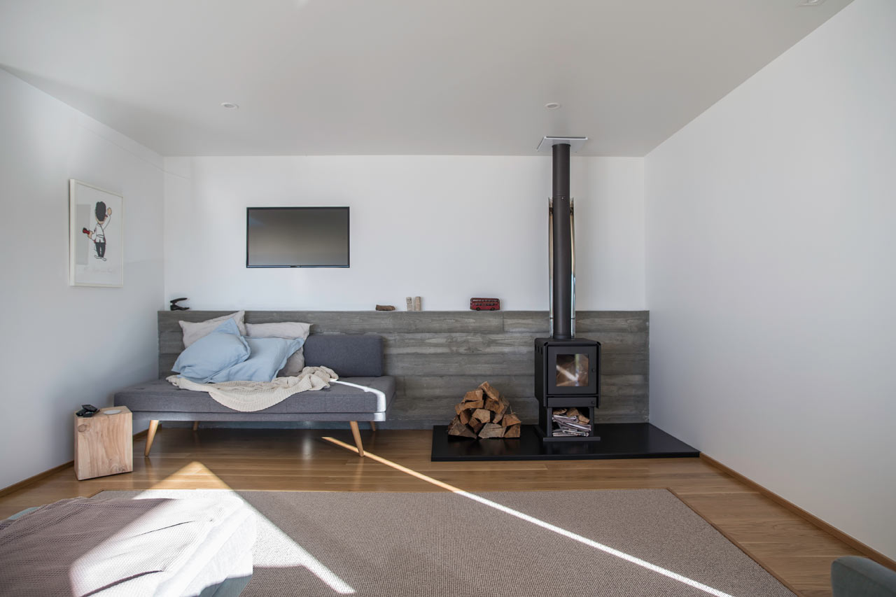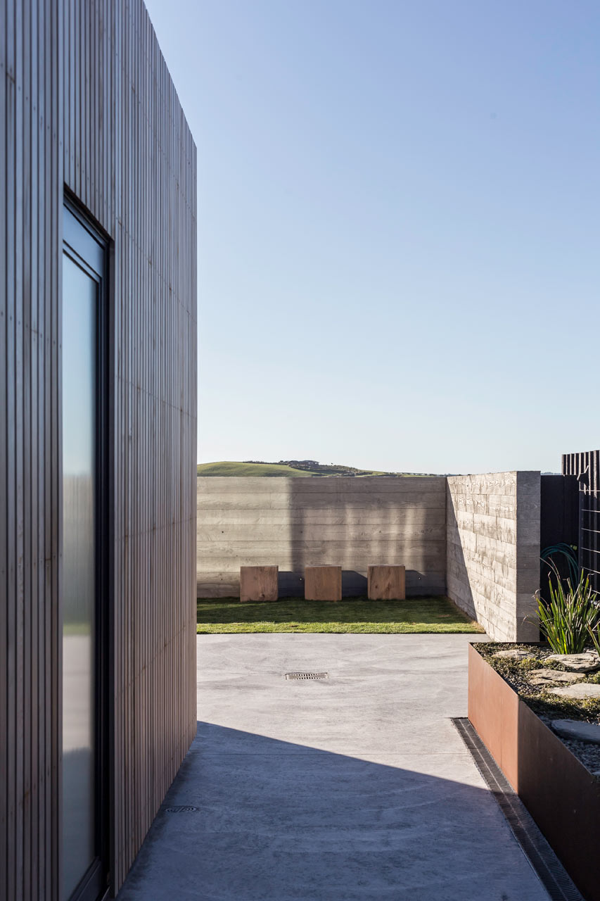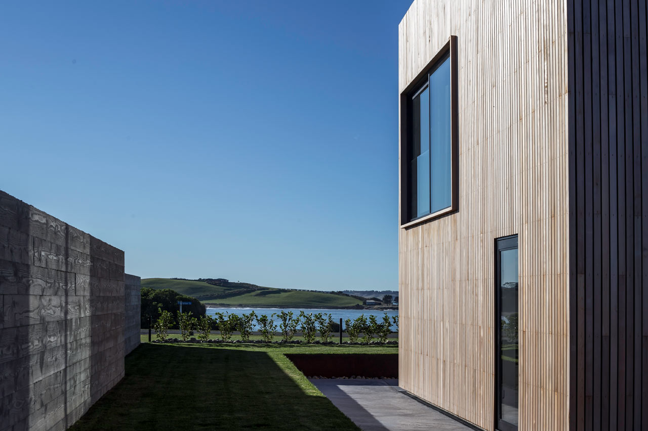 Ngoài ra, lớp bề mặt bên ngoài của ngôi nhà được tạo ra từ vân gỗ tuyết tùng, với công năng như một bức màn ngăn mưa và để nước mưa chảy dọc xuống các rãnh ở giữa các thanh gỗ.
