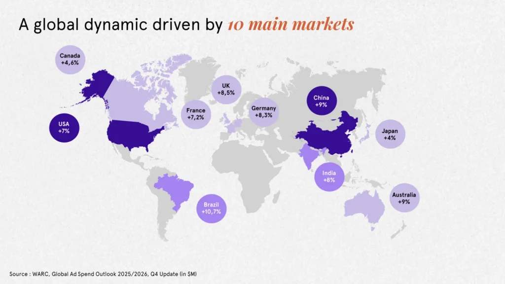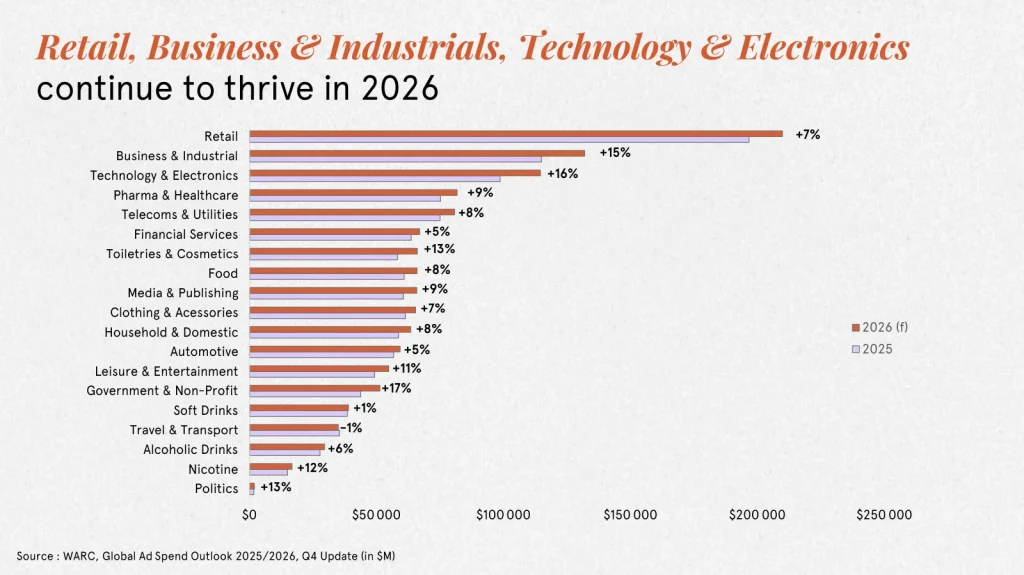 Đà tăng này dự kiến duy trì quanh mức 8% trong năm 2027, nhờ các thị trường truyền thống mạnh như Mỹ, Anh, Đức và Pháp. Các sự kiện thể thao lớn điển hình như World Cup tổ chức tại Bắc Mỹ, đóng vai trò chất xúc tác quan trọng. Nếu ngành bán lẻ vẫn là nhóm chi tiêu lớn, thì lĩnh vực công nghệ và B2B mới là những ngành tăng ngân sách mạnh nhất để phục vụ quá trình số hóa.