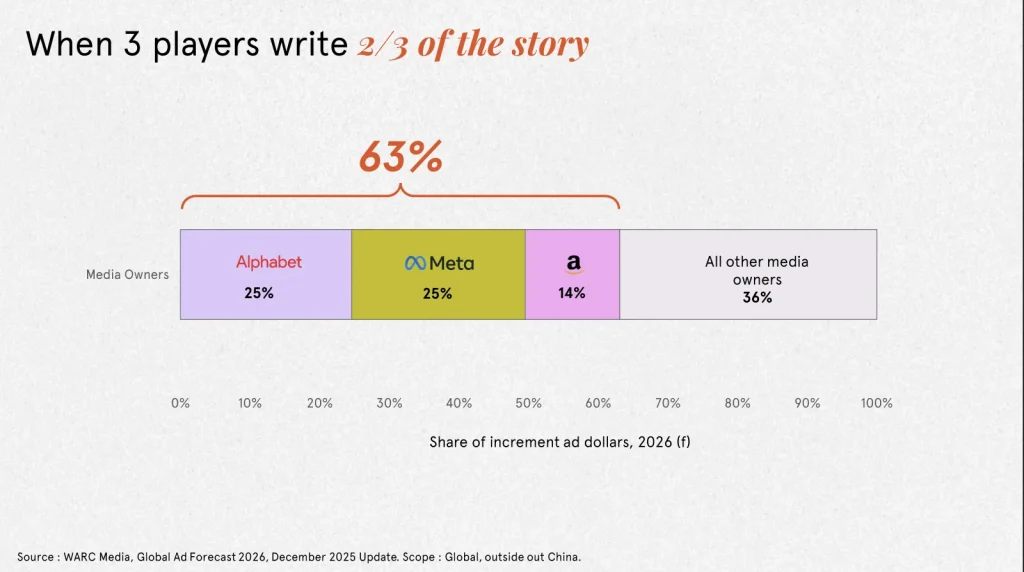 Đáng lo hơn cho sự đa dạng của hệ sinh thái, phần lớn “miếng bánh” này rơi vào tay một bộ ba bất khả xâm phạm: Alphabet, Meta và Amazon. Ba tập đoàn này chiếm gần hai phần ba mức tăng trưởng toàn cầu (không tính thị trường Trung Quốc). Search, social media và retail media đang thống trị tuyệt đối.