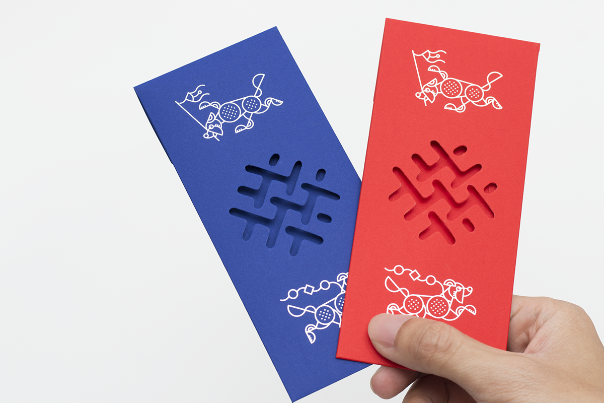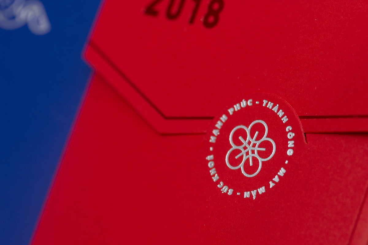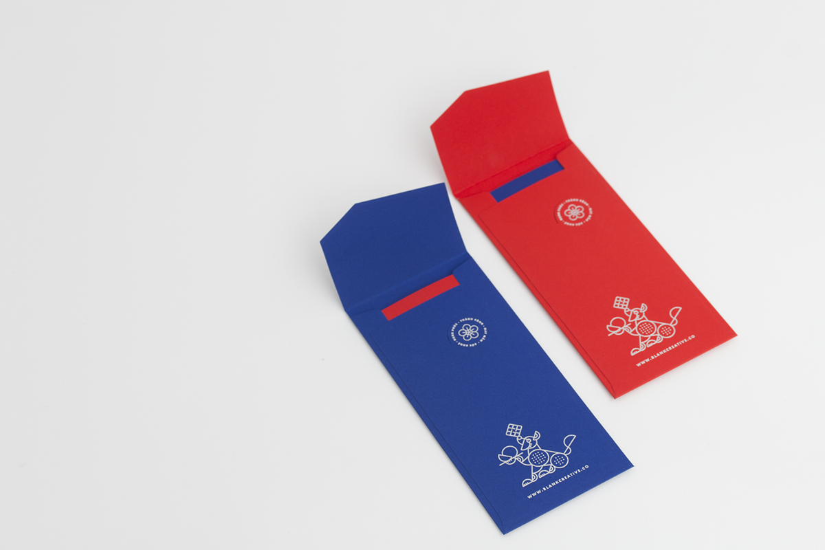 Blank Studio muốn tạo ra một thiết kế “bao đỏ” theo một cách mới, hiện đại nhưng truyền thống, sang trọng nhưng thân thiện với hình thức đặc biệt, kỹ thuật in hạn chế và lựa chọn vật liệu cẩn thận. Bạc, đỏ, đóng đinh trong suốt và die-cut được ứng dụng, kết hợp tạo ra một thiết kế độc đáo.