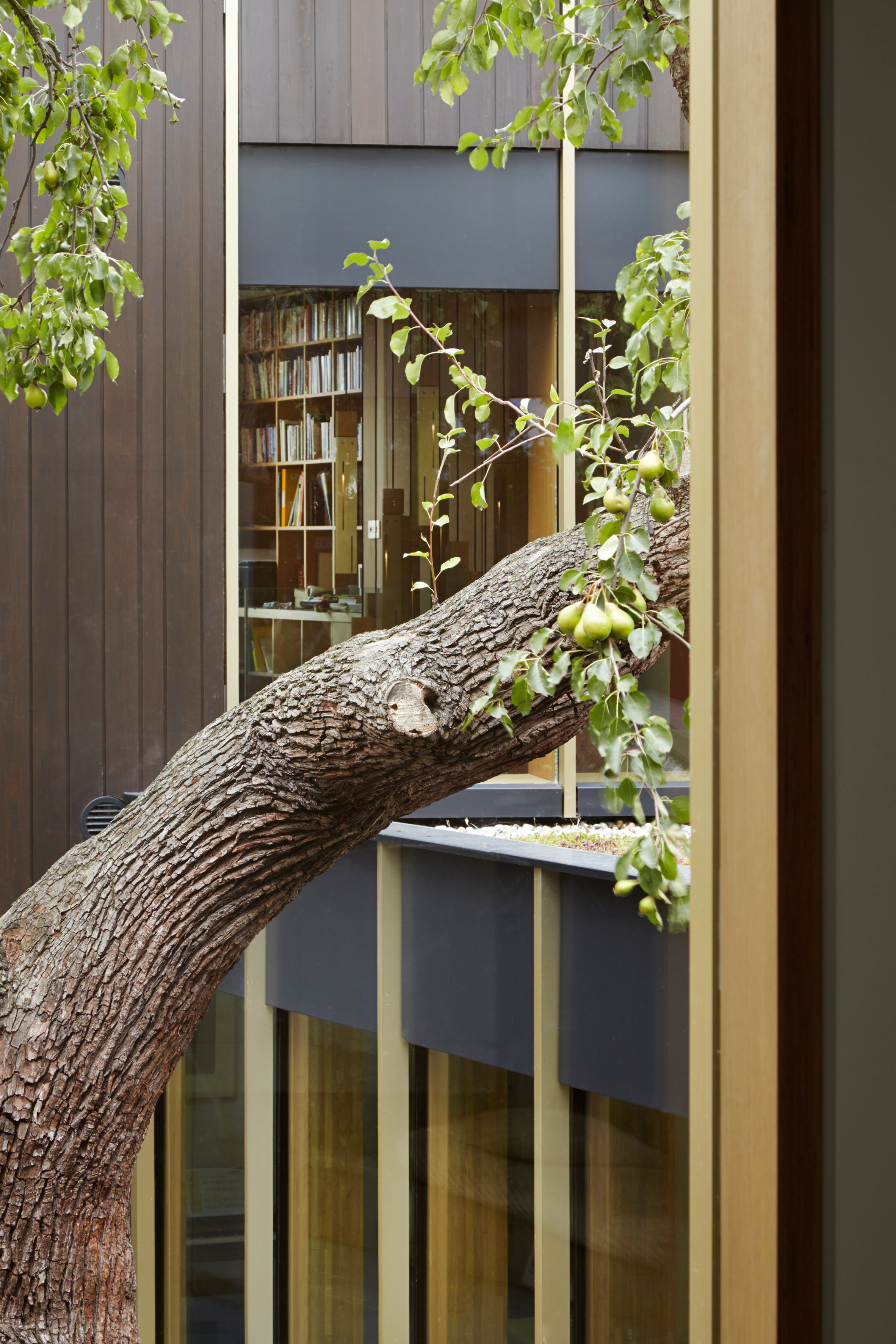 Một hàng cột được tạo thành từ các glulam, tường được làm bằng kính và mái nhà tạo lên sự liên kết và bảo vệ cả 2 khu của ngôi nhà, và đó cũng chính là mục đích của cây lê.
