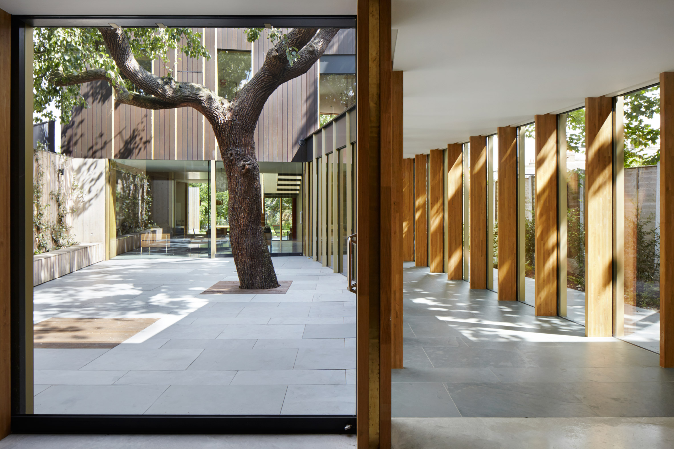 “Ngôi nhà được xây dựng xung quanh cái cây, tạo nên một khoảng sân rộng, đáp ứng đủ ánh sáng và không khí, xoay ngôi nhà vào trong giúp duy trì khoảng không riêng tư khỏi những ngôi nhà khác”
