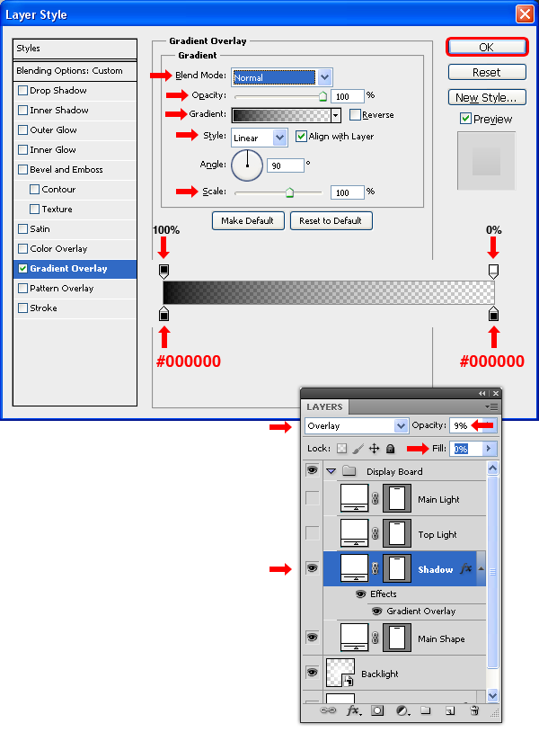 Chọn layer “Shadow”, thiết lập Blend Mode là Overlay với Opacity 9%, Fill là 0%. Vào menu Layer > Layer Styles > Blending Options, áp dụng một Gradient Overlay với các thông số sau.