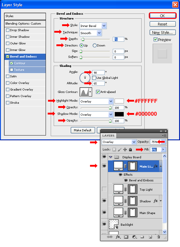 Chọn “Main Light ” layer, thiết lập Blend Mode là Overlay với Opacity 75%, Fill là 0% và vào menu Layer > Layer Styles > Blending Options và áp dụng một Bevel and Emboss với các thông số sau đây.