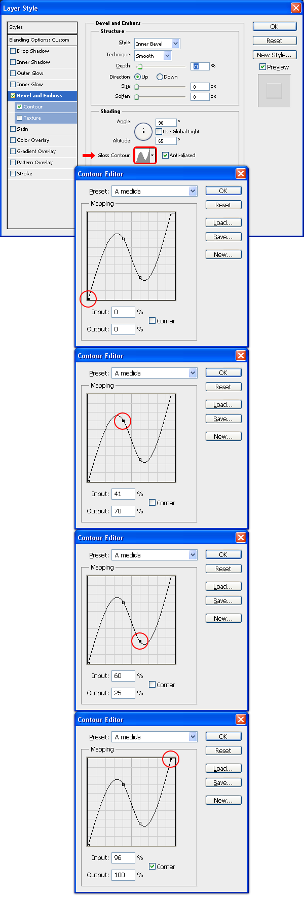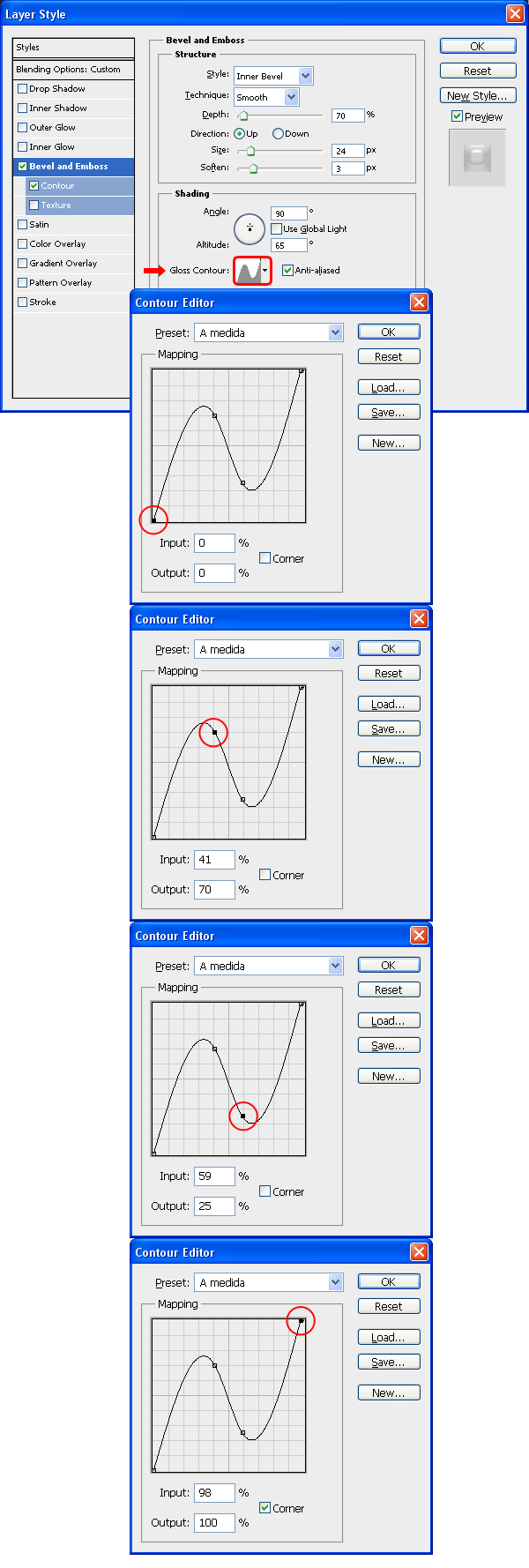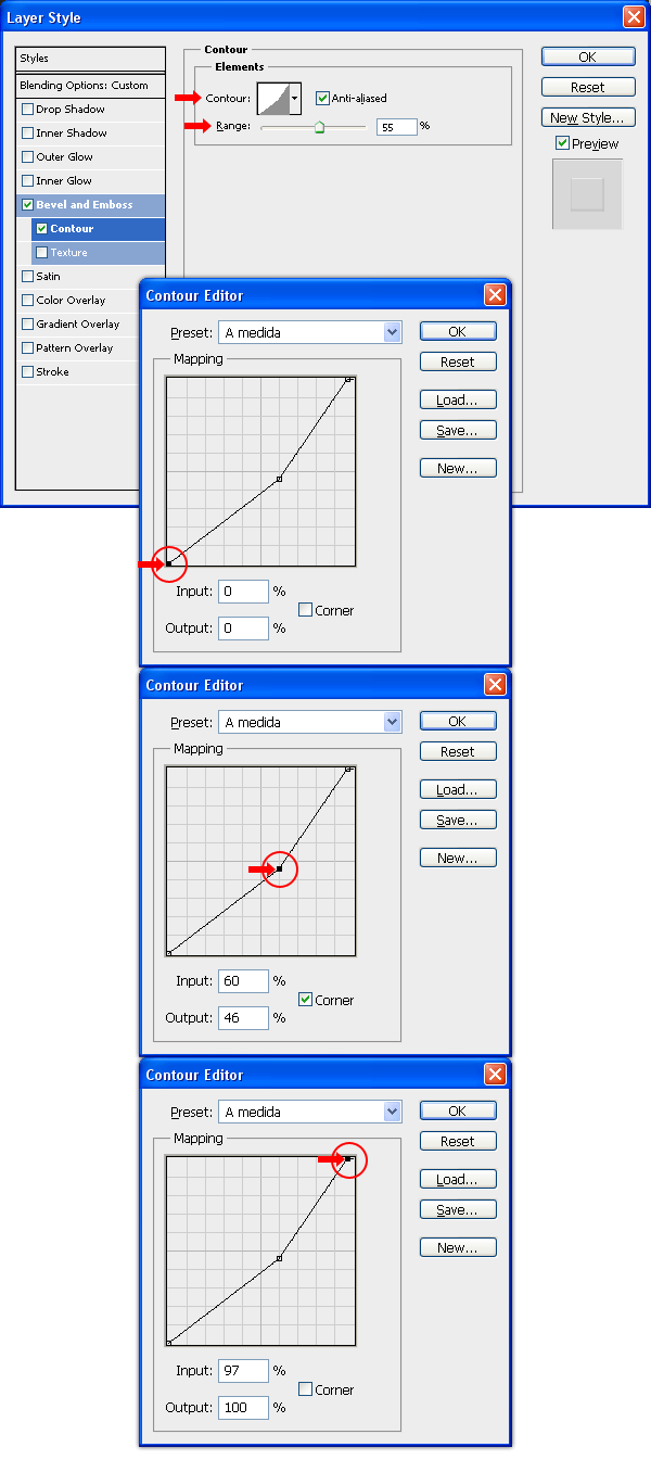 Nhấp vào các tab Countour trong bảng Layer Style, thiết lập Range là 55%, nhấp vào thumbnail Countour và trong Countour Edit thiết lập như hình minh họa dưới. Nhấn OK. Một lần nữa, nhấn OK trong cửa sổ Layer Style để áp dụng các cài đặt.