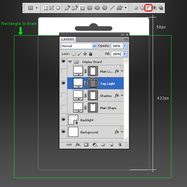 Nhấp chuột vào layer “Light”, chọn công cụ Direct Selection Tool (A), sau đó chọn công cụ Rectangle Tool (U), nhấp chuột vào biểu tượng Subtract From Shape Area và vẽ một hình chữ nhật.