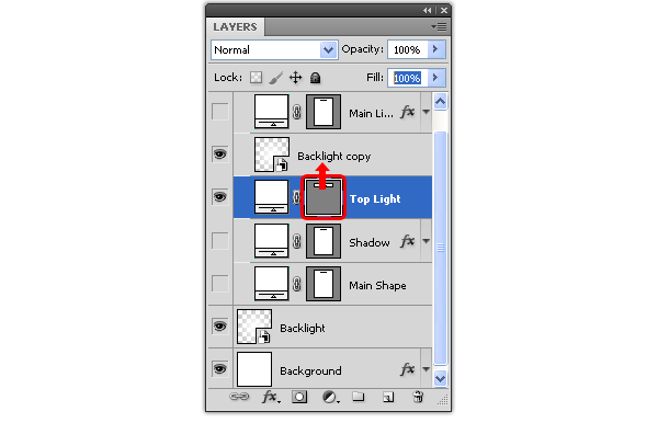 Sao chép layer “Backlight” bằng cách kéo nó vào biểu tượng New Layer trong Layer palette và đặt nó trên layer “Light”. Bây giờ hãy nhấp và kéo thumbnail Vector Mask của layer “Light Top” đến layer “Backlight copy” và thả chuột. Xóa layer “Light Top” và đổi tên layer “Backlight Copy” thành “Light Top”, thiết lập Opacity ở mức 55% và Blend Mode là Normal.