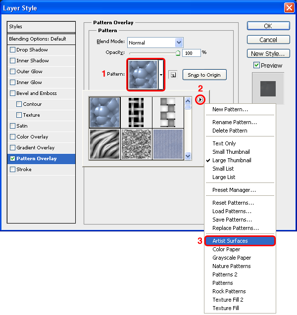 Chọn “Main Shape” vào menu Layer > Layer Styles > Blending Options > Pattern Overlay. Nhấp vào thumbnail Pattern và nhấp vào mũi tên ở phía trên bên phải của thumbnail list, chọn Artist Surfaces.