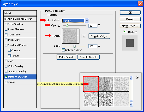 Chọn Stone (80 by 80px, chế độ thang màu xám) và gán các thông số Pattern Overlay như hình dưới. Nhấn OK.