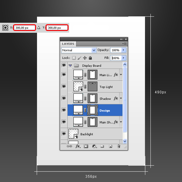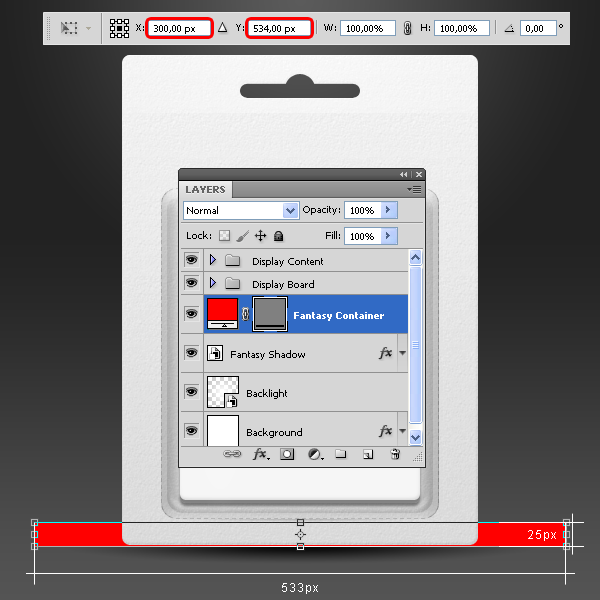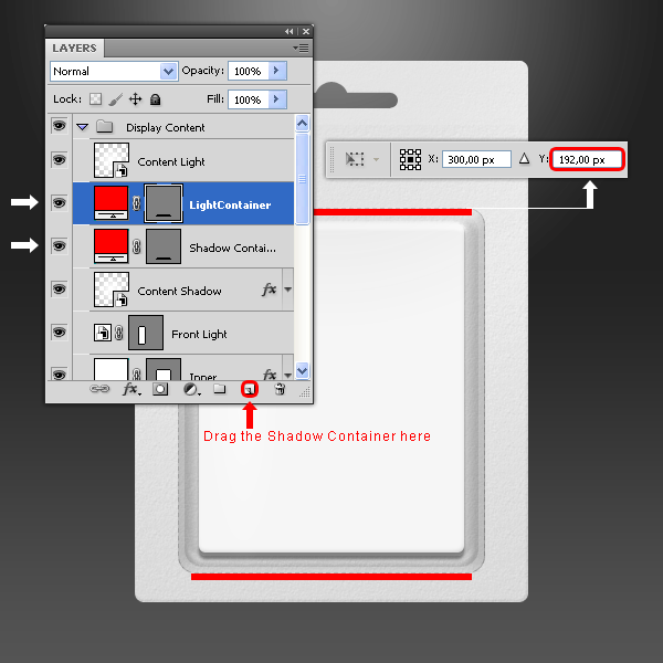 Kéo layer “Shadow Container” đến biểu tượng New Layer trong Layers palette để copy, đặt tên cho layer mới là “Light Container.” Vào Edit > Free Transform và gán giá trị Y là 192px và áp dụng những thay đổi.
