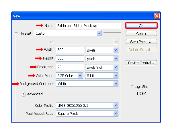 Đầu tiên, bạn cần thiết lập các thông số như sau cho file: Tên file: “Exhibition Blister Mock-up”, Kích thước file 600 x 600px, Độ phân giải: 72dpi, Hệ màu: RGB, Background: màu Trắng.
