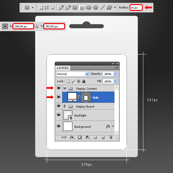 Vào menu Layer > New > Group để tạo folder và đặt tên cho nó là “Display Content”. Thiết lập màu Foreground thành màu trắng (# ffffff). Chọn Rounded Rectangle Tool (U), thiết lập giá trị Radius là 16px và vẽ một hình chữ nhật như hình minh họa bên dưới. Đặt tên layer mới là “Side”.
