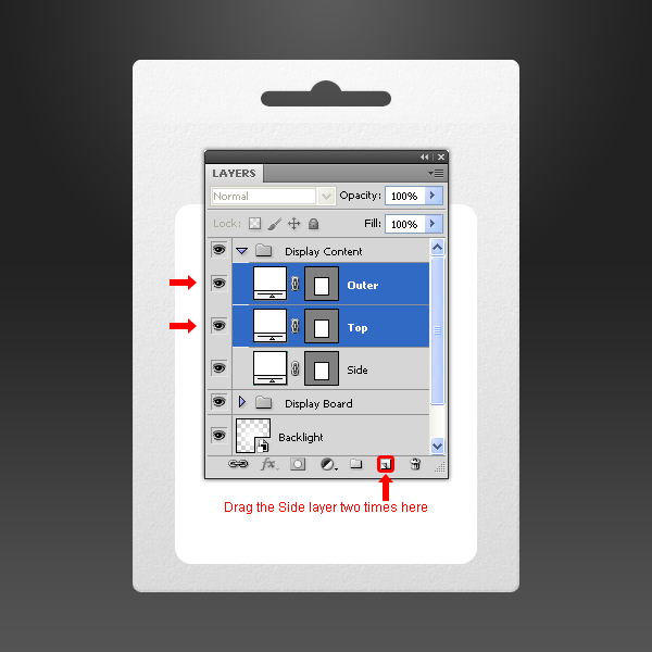 Kéo layer “Side” vào biểu tượng New Layer trong Layer palette hai lần và đặt tên mới cho 2 layer này là “Top” và “Outer”.