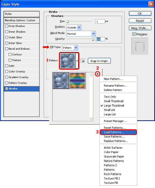 Chọn layer “Side”, thiết lập thông số Fill là 0% và vào menu Layer > Layer Styles > Blending Options, chọn tab Stroke và từ trình đơn Fill Type, chọn Pattern. Nhấp vào thumbnail Pattern, chọn vào thumbnail list và nhấp vào mũi tên ở phía trên bên phải, chọn Load Patterns, tìm folder chứa file “Side_Dot” (Dots Pattern ) pattern đã cung cấp cho các bạn trong phần stock ở trên và nhấp nút Load.