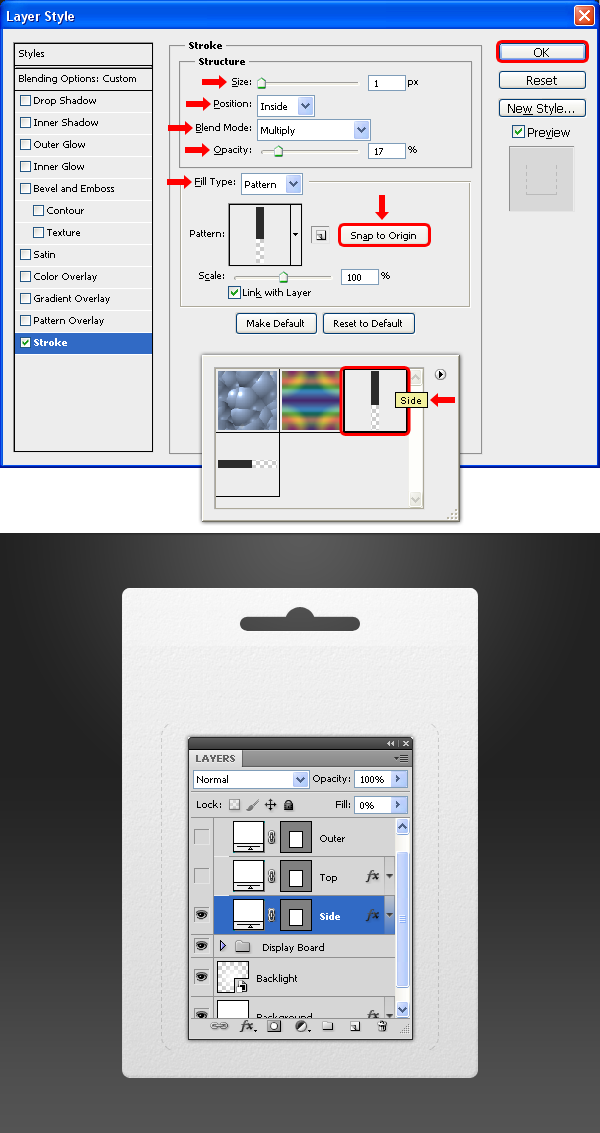 Chọn “Side” pattern và áp một Stroke với các thiết lập sau. Nhấn OK.