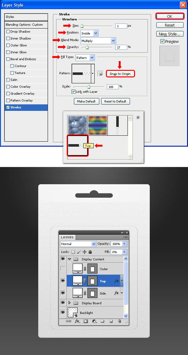 Chọn layer “Top”, thiết lập Fill là 0%, vào menu Layer > Layer Styles > Blending Options, chọn tab Stroke và áp dụng các thông số sau. Nhấn OK.