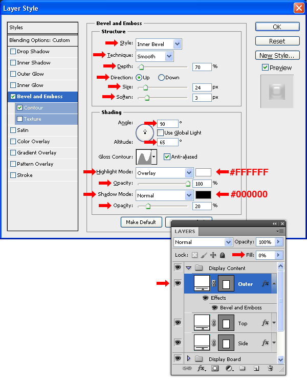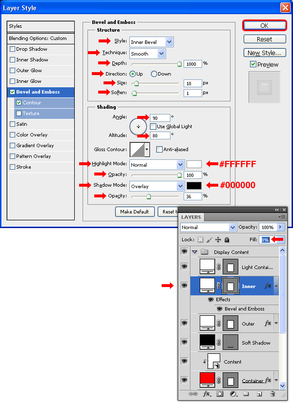 Chọn layer “Inner” và thiết lập Fill là 0%. Vào Layer> Layer Styles> Blending Options, và áp dụng một Bevel and Emboss với các thiết lập sau.