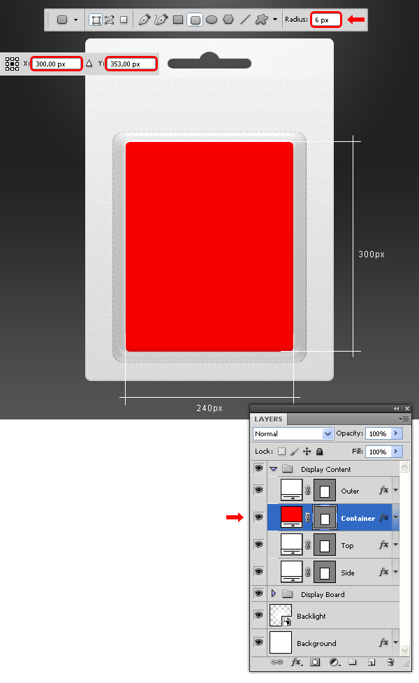 Thiết lập màu Foreground thành màu đỏ (# FF0000). Chọn Rounded Rectangle Tool (U), thiết lập với Radius là 6px và vẽ một hình chữ nhật như hình dưới. Đặt tên layer mới “Container” và đặt nó nằm dưới layer “Outer”.