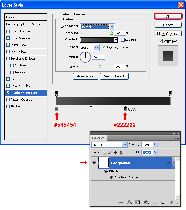 Nhấp đúp vào layer Background trong Layers palete chuyển đổi nó thành layer bình thường để bạn có thể chỉnh sửa nó. Đổi tên lại cho layer đó là “Background”. Chọn menu Layer > Layer Styles > Blending Options và gán các thông số Gradient Overlay như hình hiển thị bên dưới.