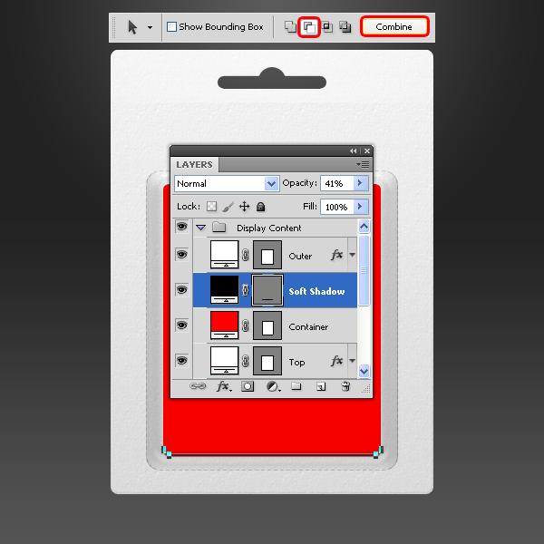 Chọn Path Selection Tool (A) và kéo một vùng chọn xung quanh toàn bộ layer “Soft Shadow”. Vào Edit> Copy, tiếp sau lại vào Edit > Paste để dán vùng chọn đã được copy. Di chuyển vùng chọn được dán qua 3px bằng cách nhấn vào mũi tên lên ba lần, chọn Subtract From Shape Area trên thanh tùy chọn của công cụ và nhấp vào nút Combine.