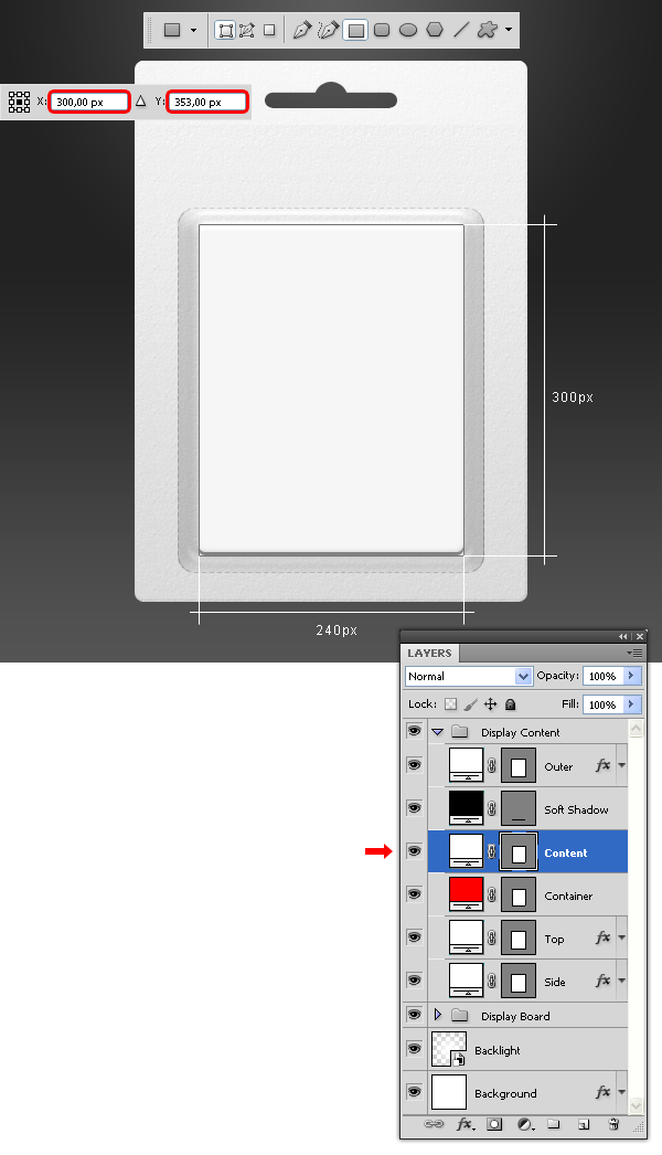 Đặt màu Foreground thành màu trắng (# ffffff). Chọn công cụ Rectangle Tool (U) và vẽ một hình chữ nhật. Đặt tên mới cho layer là “Content” và đặt nó nằm trên layer “Container”.