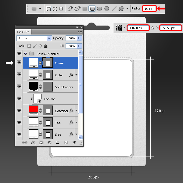 Chọn Rounded Rectangle Tool (U), thiết lập một Radius là 16px và vẽ một hình chữ nhật. Đặt tên layer mới là “Inner” và đặt nó nằm trên layer “Outer”.