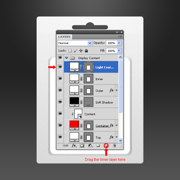 Kéo layer “Inner” đến biểu tượng New Layer trong Layers palette và đặt tên layer mới là” Light Container “.