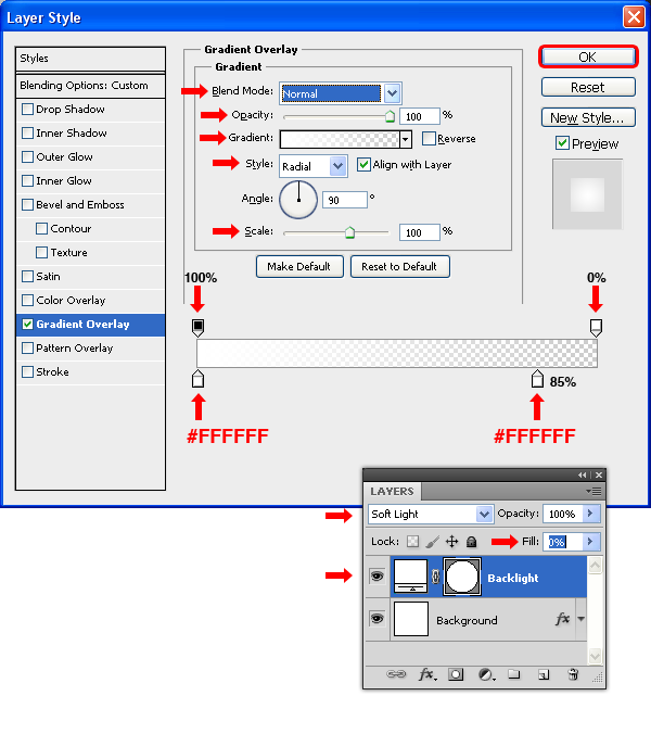 Chọn công cụ Ellipse Tool (U) và vẽ một hình tròn có đường kính 600px. Đặt tên mới cho shape layer là “Backlight” và thiết lập Fill 0%. Chọn Blend Mode là Soft Light trong Layers palete. Chọn menu Layer > Layer Styles> Blending Options và gán các thông số Gradient Overlay như hình hiển thị bên dưới.