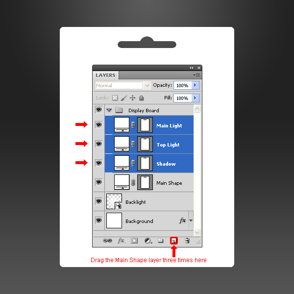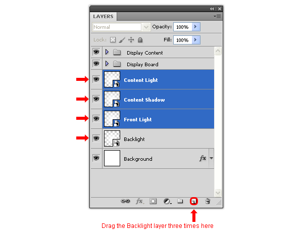 Kéo layer “Backlight” vào biểu tượng New Layer trong Layers palette 3 lần và đặt tên các layer mới lần lượt như sau ” Front Light “, ” Content Shadow ” và ” Content Light”.