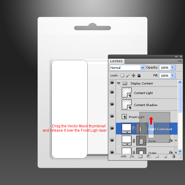 Chọn layer “Light Container”, kéo thumbnail Vector Mask đến layer “Front Light” và thả chuột. Xóa layer ” Light Container “.