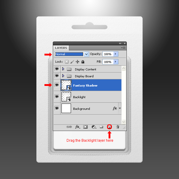 Giữ chuột kéo và thả layer “Backlight” để biểu tượng New Layer trong Layers palette và đặt tên layer mới là “Fantasy Shadow”, thiết lập Blend Mode là Normal.