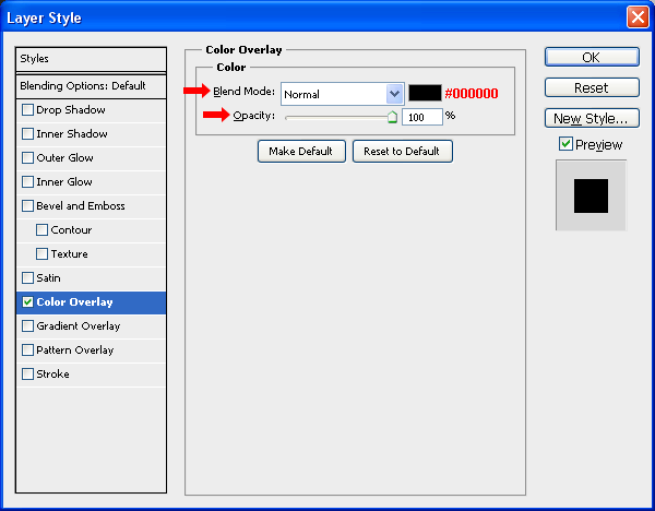 Chọn layer “Content Shadow”, vào menu Layer > Layer Styles> Blending Options > Color Overlay với Blend Mode là Normal, chọn màu đen (# 000000) và Opacity 100%. Nhấn OK. Thiết lập Blend Mode là Normal và Opacity 18% trong Layer palette.