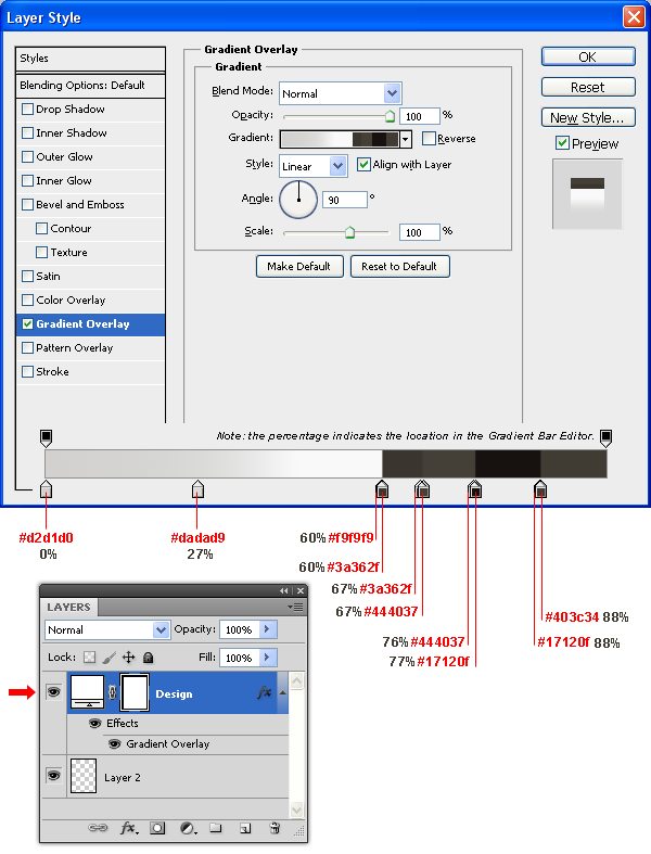 Vào nhóm layer “Display Board”, chọn layer “Design” và nhấp đúp chuột vào thumbnail smart object. Trong cửa sổ tài liệu mới, chọn “Design” layer và vào menu Layer > Layer Style > Blending Options và áp dụng một Gradient Overlay với các thông số sau.