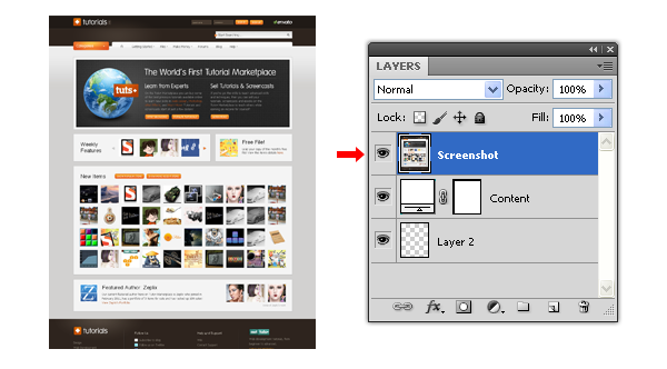 Vào nhóm layer “Display Content”, chọn layer “Content” và nhấp đúp chuột vào thumbnail smart object. Trong cửa sổ tài liệu mới dán hình chụp màn hình của file “Screenshot of Tutorials marketplace” đã được cung cấp trong phần stock ở trên (hoặc bạn có thể đưa bất kỳ thiết kế nào mà bạn muốn). Nếu cần thiết, bạn có thể điều chỉnh kích thước ảnh chụp màn hình và bạn làm việc này bằng cách vào menu Edit > Free Transfom. Lưu tài liệu và đóng nó lại.
