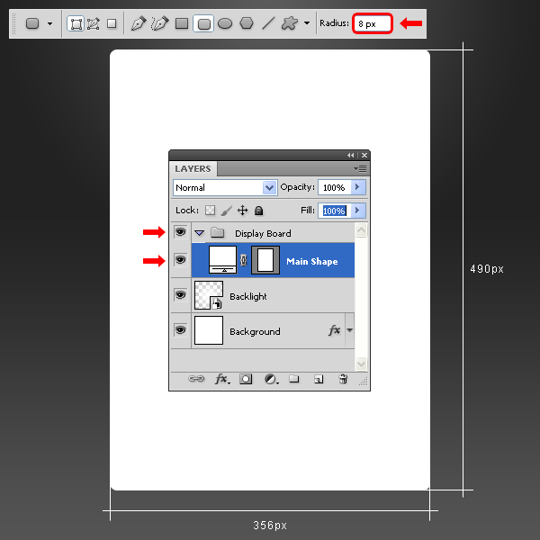 Vào menu Layer > New > Group và đặt tên cho group là “Display Board”. Thiết lập màu Foreground thành màu trắng (# ffffff). Chọn Rounded Rectangle Tool (U), nhập giá trị Radius bằng 8px và vẽ một hình chữ nhật như hình được hiển thị bên dưới và đặt tên mới cho layer là “Main Shape”.
