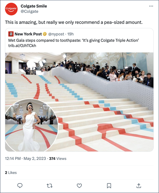 Thì ra, các sọc đỏ và xanh được trang trí ngẫu nhiên trên chiếc thảm đỏ của Met Gala đã khiến nhiều người liên tưởng đến vệt kem đánh răng của Colgate. Không bỏ lỡ cơ hội ngàn vàng này, thương hiệu chăm sóc sức khoẻ răng miệng cũng đã nhanh chóng lên các kênh mạng xã hội của mình đáp trả một cách vô cùng hài hước để “ăn theo” dòng sự kiện.
