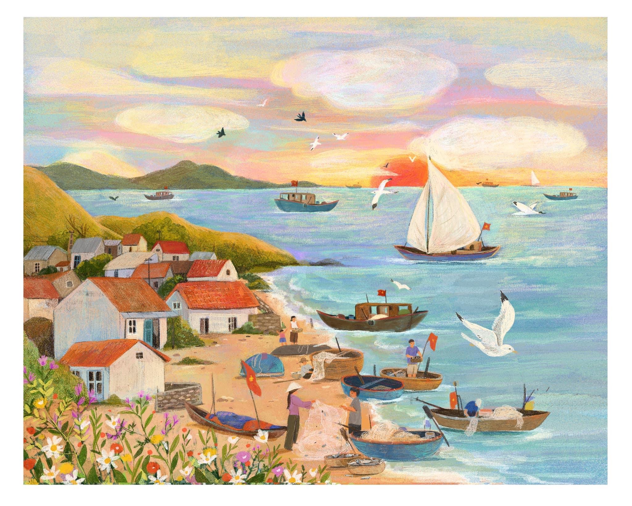 Dự án mình được học hỏi nhiều nhất cũng là bộ sách đầu tiên mình được mời vẽ cho bộ thơ thiếu nhi, và cũng là lần đầu mình được vẽ nhiều tranh đến như vậy, mình được sự động viên từ biên tập, đồng hành và hỗ trợ rất nhiều từ nhà xuất bản để bộ sách được xuất bản thành công. Và đến giờ nó vẫn là bộ sách ý nghĩa và tâm đắc nhất của mình, thật may mắn là tranh trong bộ sách này được gửi tham dự triển lãm Asian Festival of Children’s Content tổ chức tại Singapore và tháng 5/2023 này.