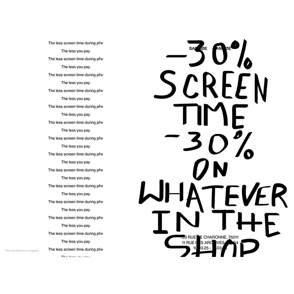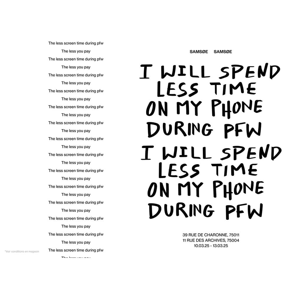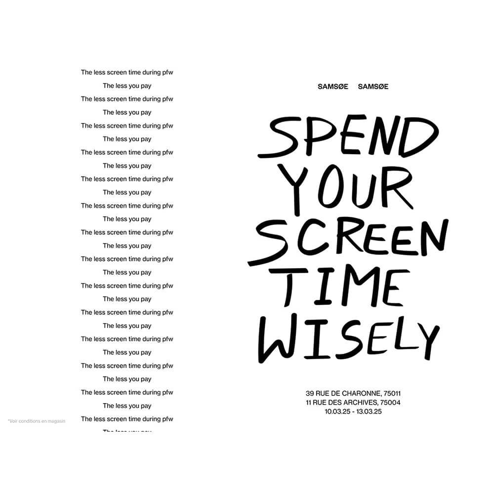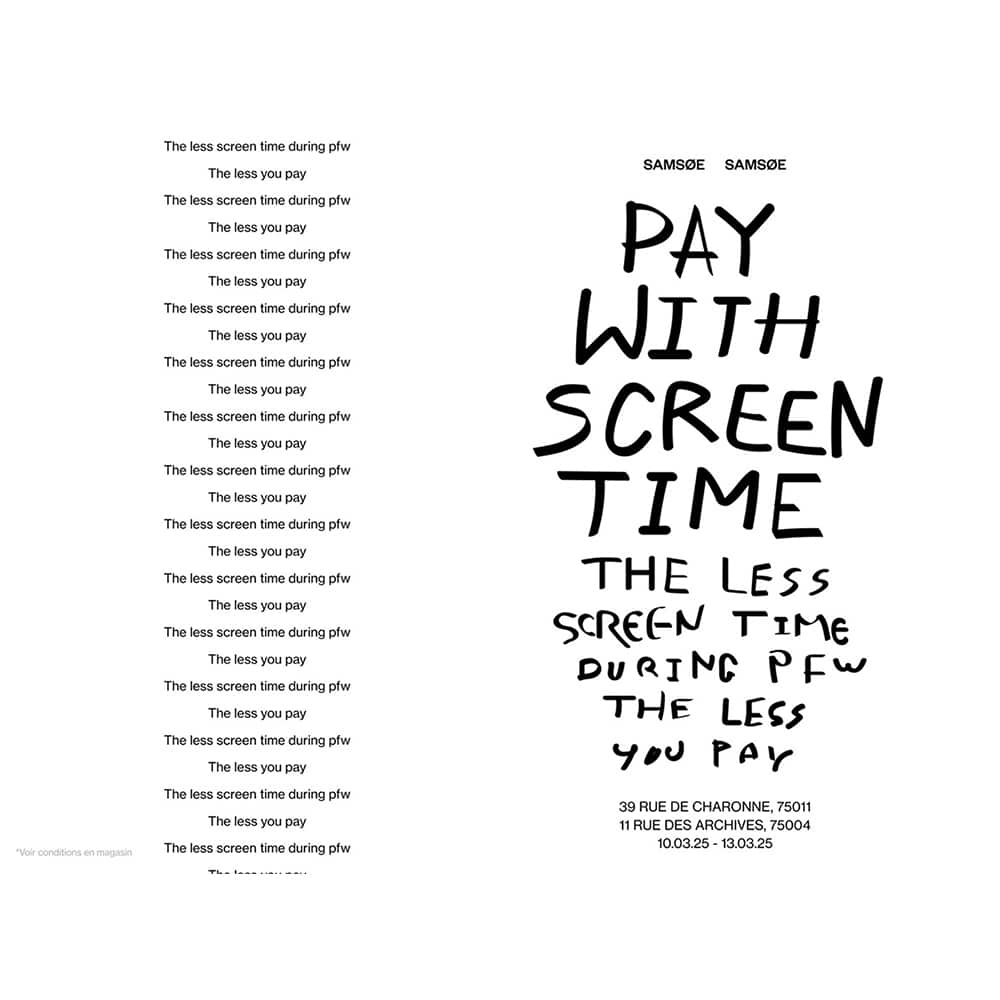 Chiến dịch “Pay with Screen Time” được áp dụng trong suốt Tuần lễ Thời trang Paris tại các cửa hàng Samsøe Samsøe trên đường des Archives và de Charonne ở Paris. Với sáng kiến này, Samsøe Samsøe khuyến khích khách hàng suy ngẫm mối quan hệ của họ với công nghệ, tận hưởng những khoảnh khắc thực tế và được thưởng bằng các ưu đãi mua sắm. Đây là một cách tiếp cận sáng tạo nhằm thúc đẩy lối sống lành mạnh hơn trong thời đại số hóa.