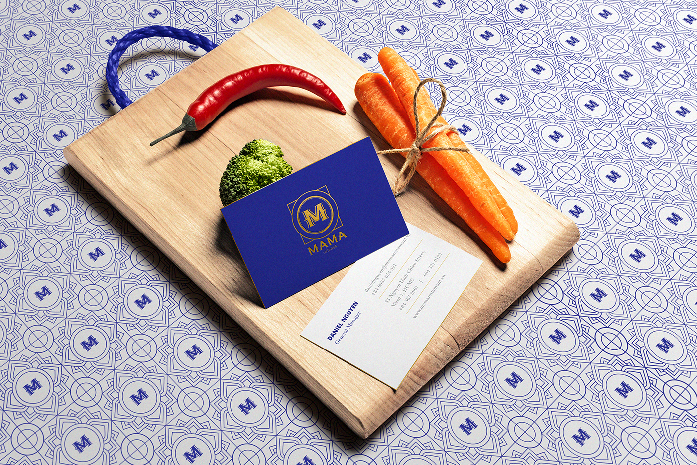 Biểu tượng nhà hàng được lấy cảm hứng từ hình dáng phổ biến của những tấm khăn ăn chỉn chu kết hợp cùng chữ M – đặc trưng của tên gọi. Bằng cách sử dụng những màu sắc truyền thống nhưng sang trọng như: màu Vàng (tượng trưng cho hoàng gia), màu Xanh (tượng trưng cho truyền thống Á châu). Rabbat mong muốn tạo ra một thương hiệu MAMA độc đáo hài hòa nét truyền thống, đậm chất Á châu pha trộn với màu sắc phong phú từ các món ăn Thái Lan đầy hấp dẫn.