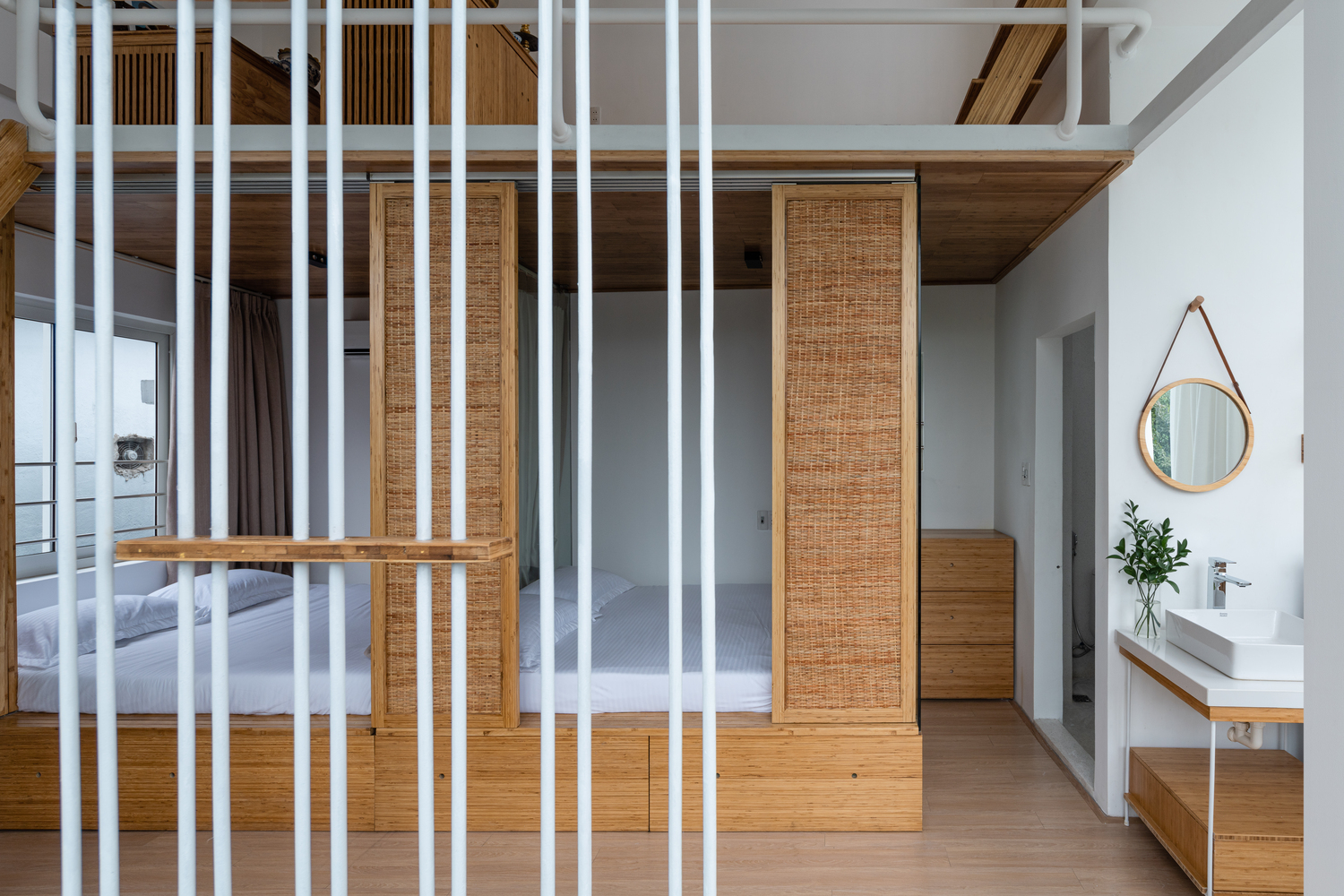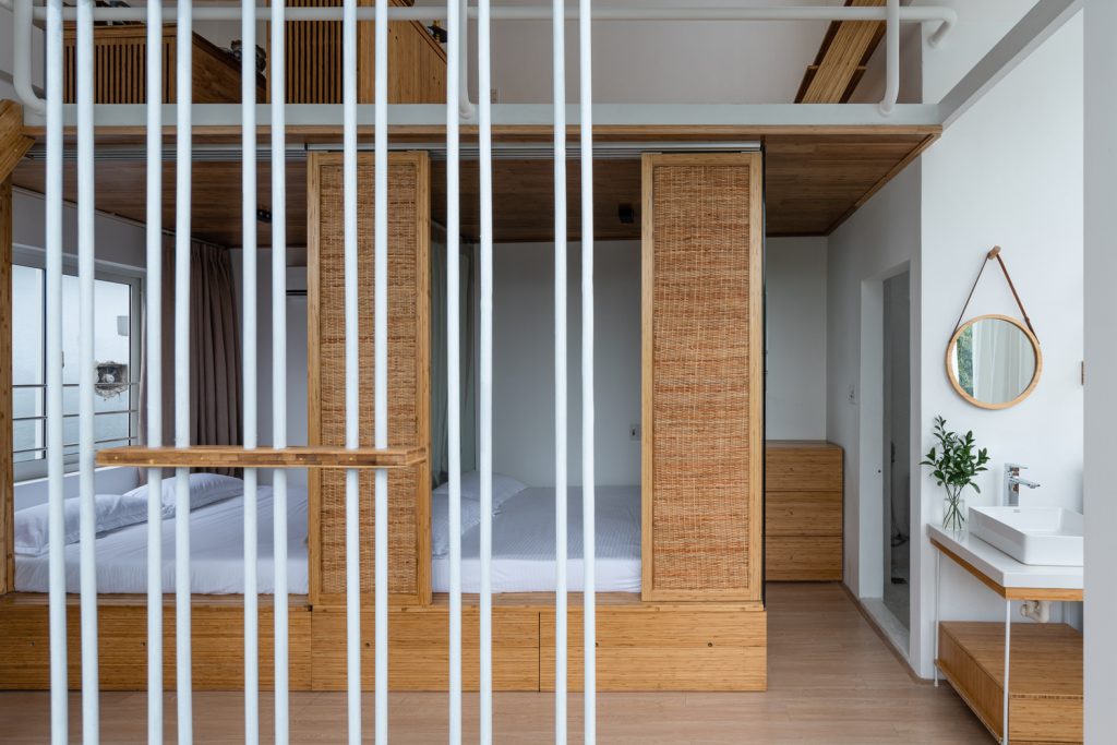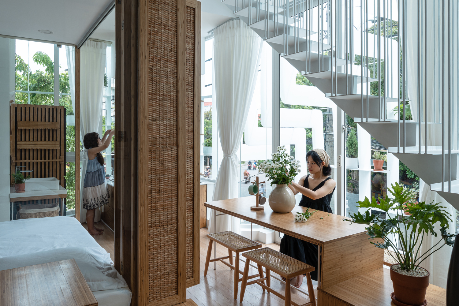 Cầu thang xoắn ốc cũ và không hiệu quả đã được thay thế bằng một cái khác thẳng hơn, giúp tối ưu hóa không gian và đạt được lưu thông tốt hơn. Nội thất trong nhà chủ yếu được làm bằng tre, là một vật liệu bền vững và thân thiện với môi trường. Tre cũng có một số đặc điểm nổi bật phù hợp để sử dụng ở vùng khí hậu khắc nghiệt tại Huế.