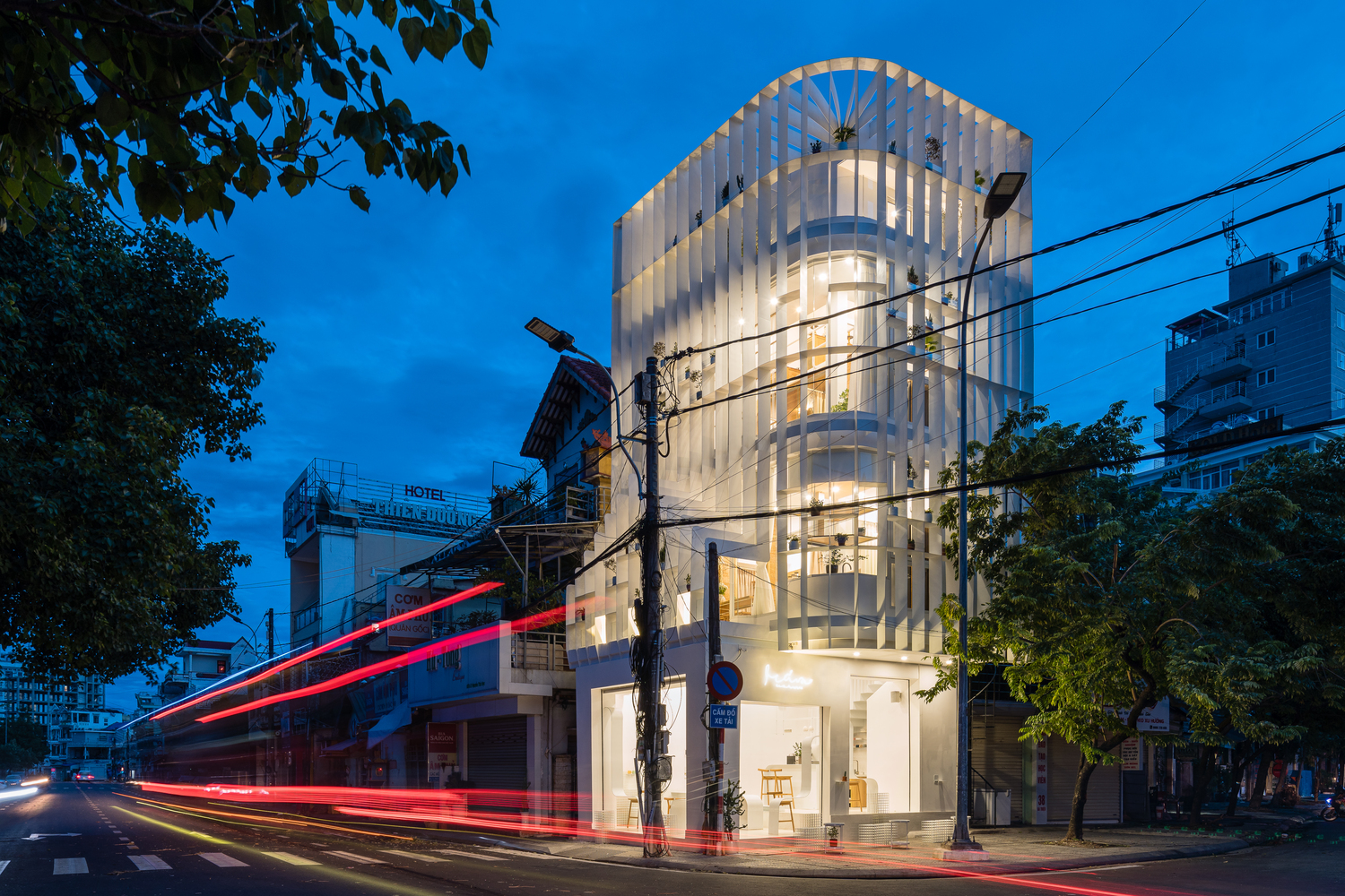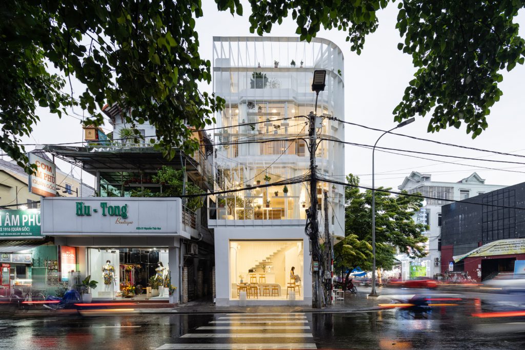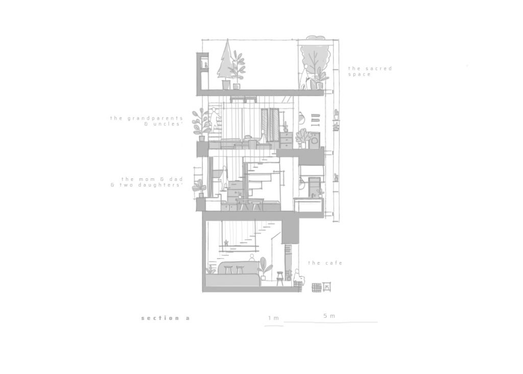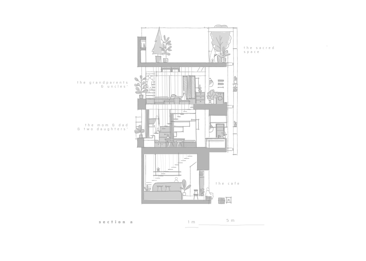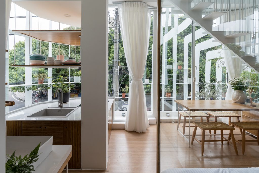 Tiam có ba tầng, một gác mái, ban công và sân thượng. Tầng đầu tiên dành cho quán cà phê, được điều hành bởi gia chủ, và phần còn lại của tòa nhà là để sống. Các cửa sổ dọc và tường thủy tinh bao phủ ngôi nhà giống như một phân vùng mơ hồ giữa “vào và ra”, đưa mọi người vào trong ngôi nhà gần gũi với thiên nhiên và ra với những người khác trên đường phố.